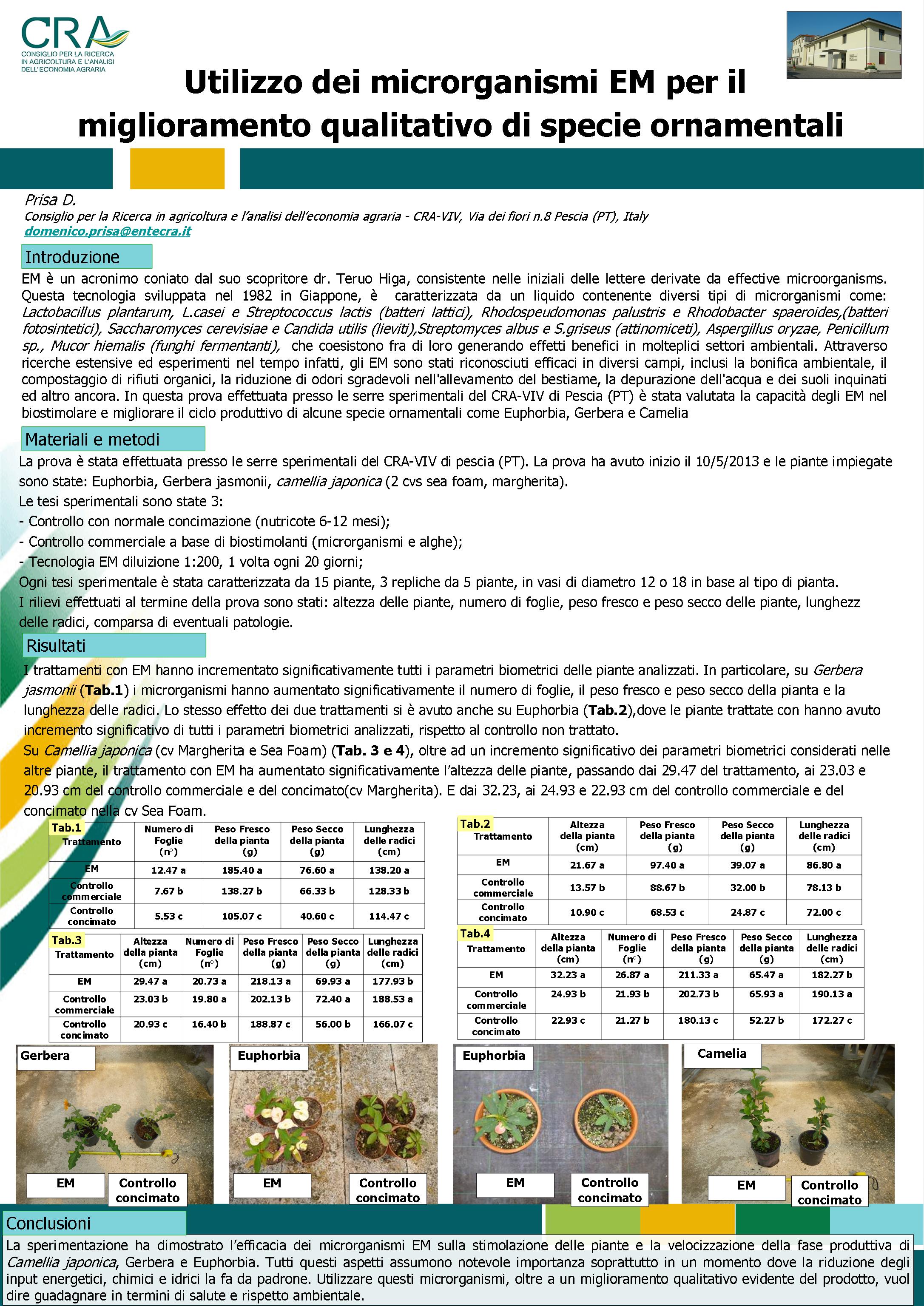 In questo lavoro vengono presentati i risultati di una sperimentazione effettuata dal dr. Prisa e presentata al convegno della Soi. I microrganismi EM hanno dimostrato la loro efficacia nel miglioramento della qualità di piante ornamentali.