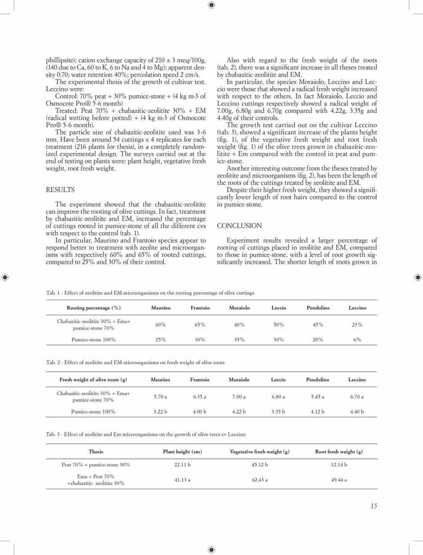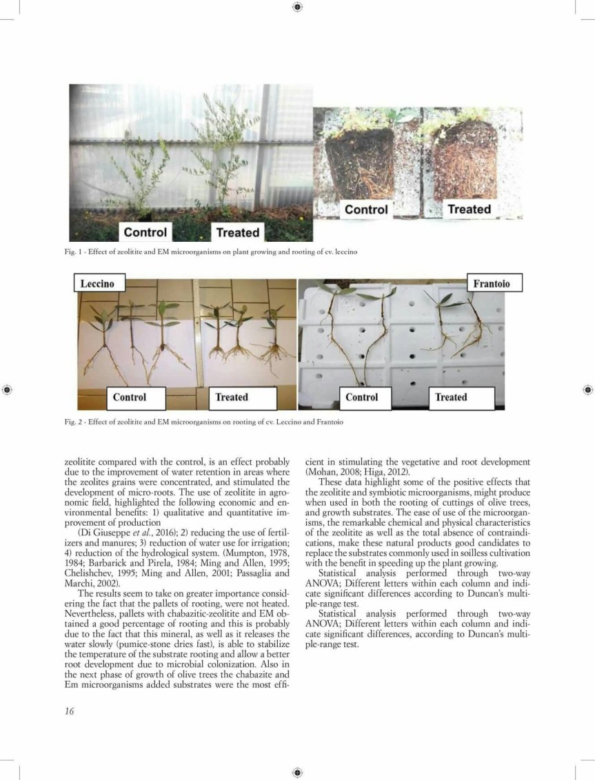Il test ha dimostrato una maggiore percentuale di radicazione delle talee di olivo nella miscela zeolitite e EM, rispetto a quelle torba e pomice. Si sono riscontrati livelli di crescita delle radici significativamente aumentati.