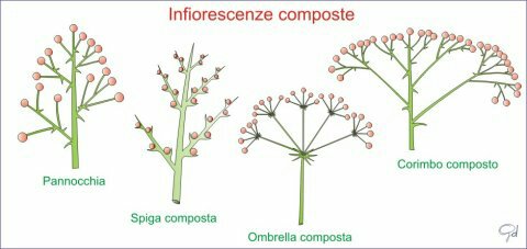 – corimbo: fiori peduncolati che si dipartono da punti diversi di un breve asse fiorale, dando un insieme globoso (melo)