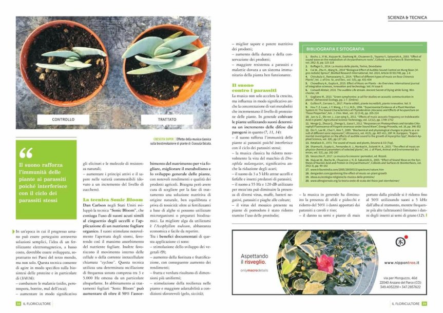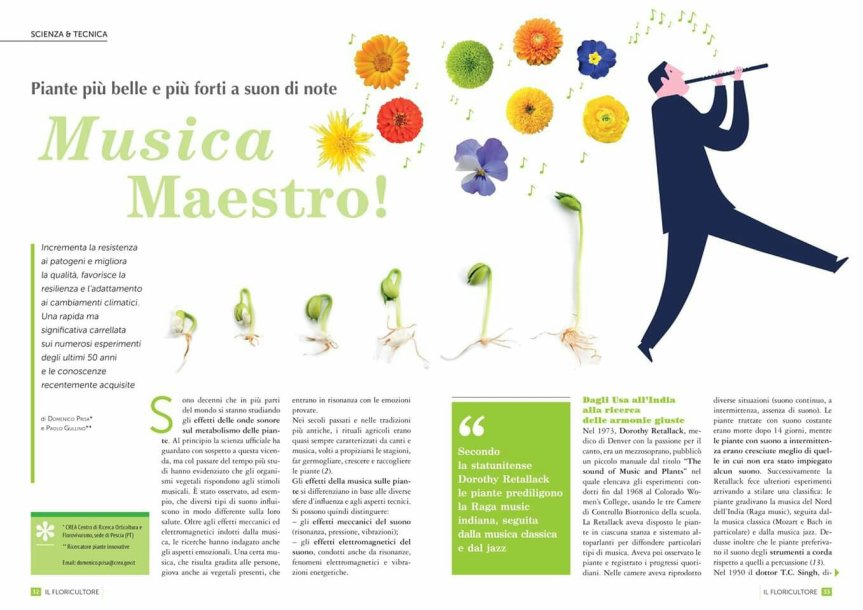 Sono decenni che in più parti del mondo si stanno studiando gli effetti delle onde sonore sul metabolismo delle piante. Al principio la scienza ufficiale ha guardato con sospetto a questa vicenda, ma col passare del tempo più studi hanno evidenziato che gli organismi vegetali rispondono agli stimoli musicali. È stato osservato, ad esempio, che diversi tipi di suono influiscono in modo differente sulla loro salute. Oltre agli effetti meccanici ed elettromagnetici indotti dalla musica, le ricerche hanno indagato anche gli aspetti emozionali. Una certa musica, che risulta gradita alle persone, giova anche ai vegetali presenti, che entrano in risonanza con le emozioni provate. Nei secoli passati e nelle tradizioni più antiche, i rituali agricoli erano quasi sempre caratterizzati da canti e musica, volti a propiziarsi le stagioni, far germogliare, crescere e raccogliere le piante
