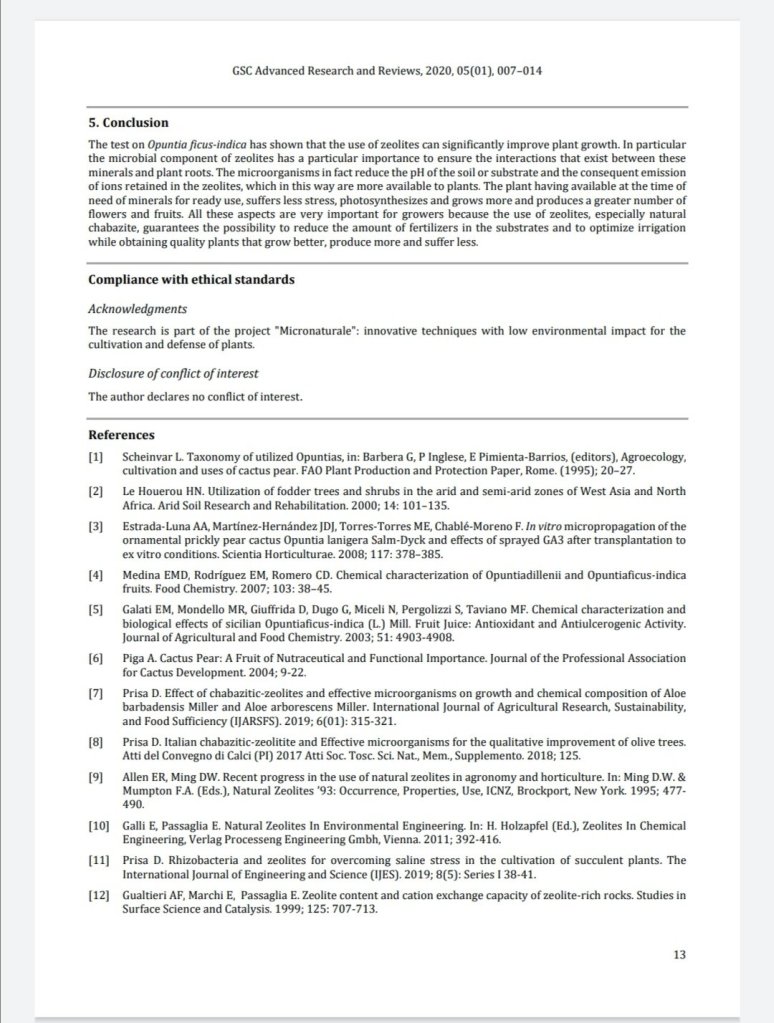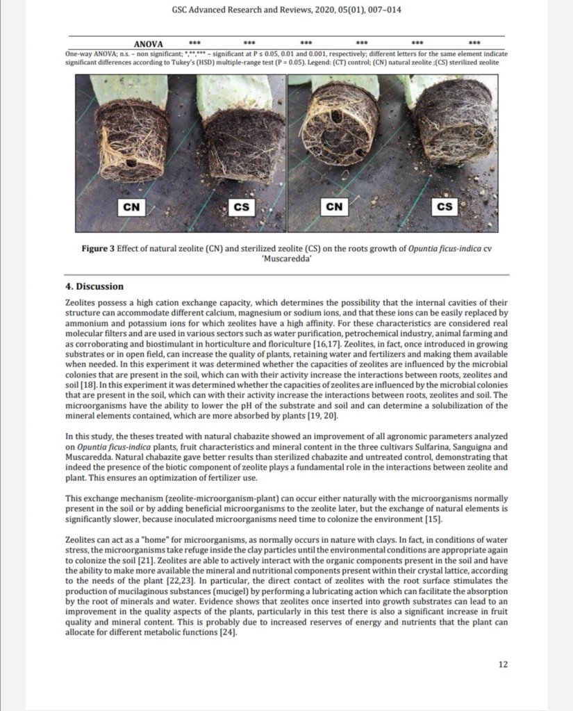 In this experiment it was determined whether the capacities of zeolites are influenced by the microbial colonies that are present in the soil, which can with their activity increase the interactions between roots, zeolites and soil. The microorganisms have the ability to lower the pH of the substrate and soil and can determine a solubilization of the mineral elements contained, which are more absorbed by plants. The experimental groups were: i) group without zeolites, irrigated with water and substrate previously fertilized; ii) group with natural chabazite and fertilised substrate; iii) group with sterilized chabazite and fertilised substrate. The zeolite was sterilized at high pressure saturated steam at 121 ° C for about 20 minutes. The theses treated with natural chabazite showed an improvement of all agronomic parameters analyzed on Opuntia ficus-indica plants, fruit characteristics and mineral content in the three cultivars Sulfarina, Sanguigna and Muscaredda. Natural chabazite gave better results than sterilized chabazite and untreated control, demonstrating that indeed the presence of the biotic component of zeolite plays a fundamental role in the interactions between zeolite and plant. All these aspects are very important for growers because the use of zeolites, especially natural chabazite, guarantees the possibility to reduce the amount of fertilizers in the substrates and to optimize irrigation while obtaining quality plants that grow better, produce more and suffer less.