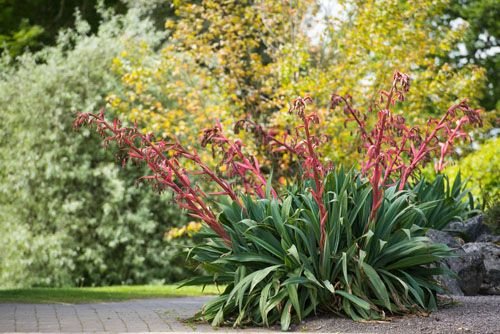 È un’erbacea rizoma tosa che forma una rosetta di foglie verde-blu, persistenti, strette e allungate. Le spettacolari infiorescenze compaiono da giugno ad agosto, con grossi scapi rossastri che si piegano come se stessero crollando sotto il peso dei fiori. I fiori tubulosi, sono largamente avvolti da brattee rosse molto decorative. I fiori sono ricchi di nettare e sono frequentati da colibrì che assicurano l’impollinazione.