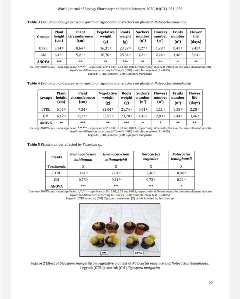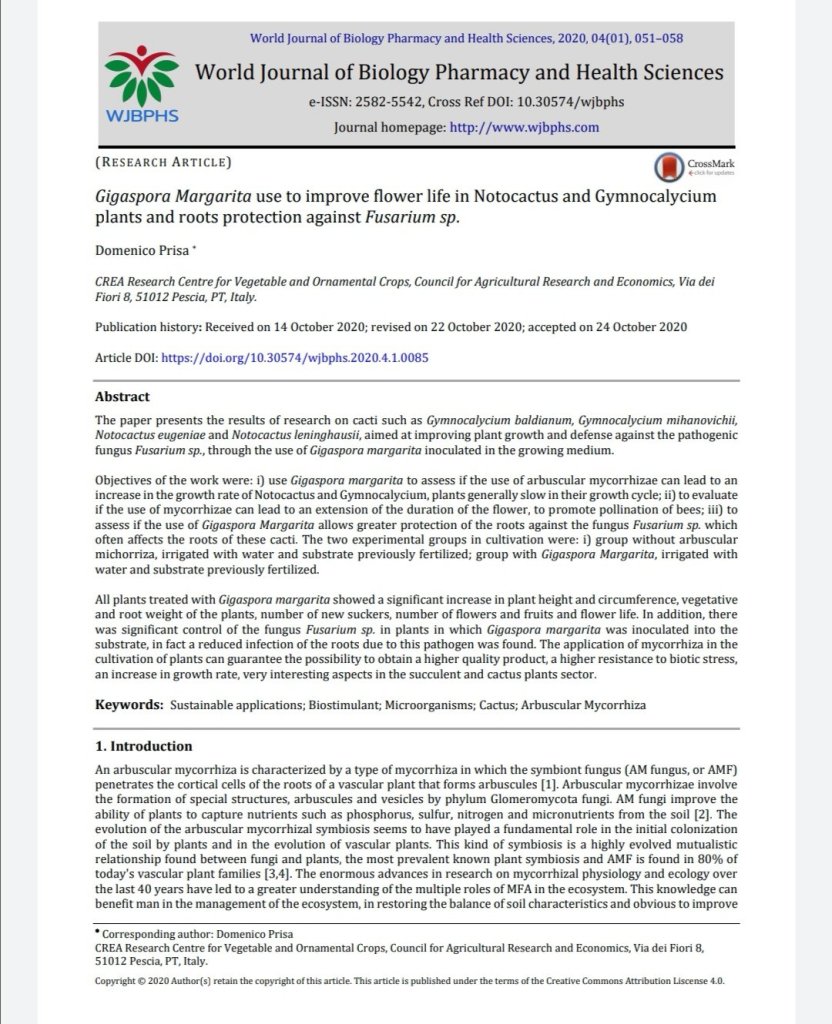 All plants treated with Gigaspora margarita showed a significant increase in plant height and circumference, vegetative and root weight of the plants, number of new suckers, number of flowers and fruits and flower life. In addition, there was significant control of the fungus Fusarium sp. in plants in which Gigaspora margarita was inoculated into the substrate, in fact a reduced infection of the roots due to this pathogen was found. The application of mycorrhiza in the cultivation of plants can guarantee the possibility to obtain a higher quality product, a higher resistance to biotic stress, an increase in growth rate, very interesting aspects in the succulent and cactus plants sector.