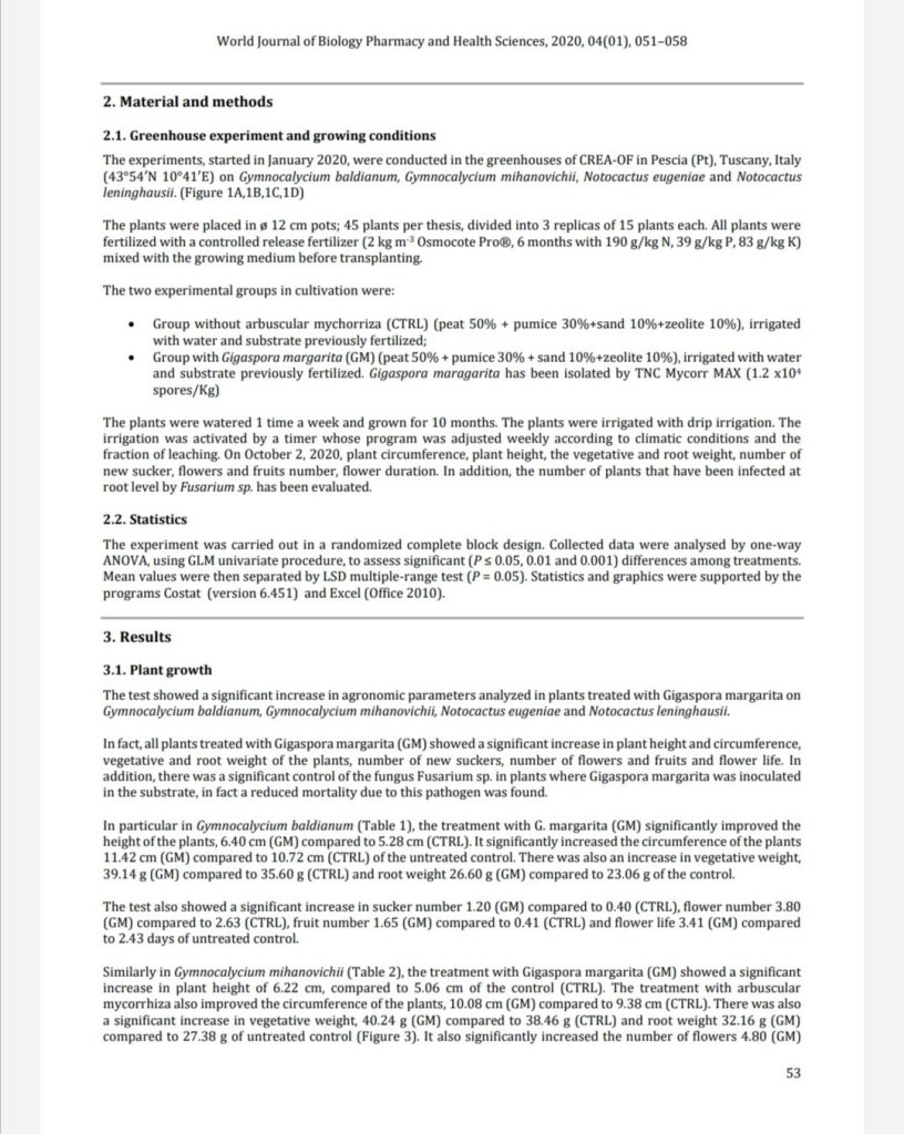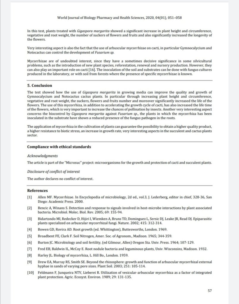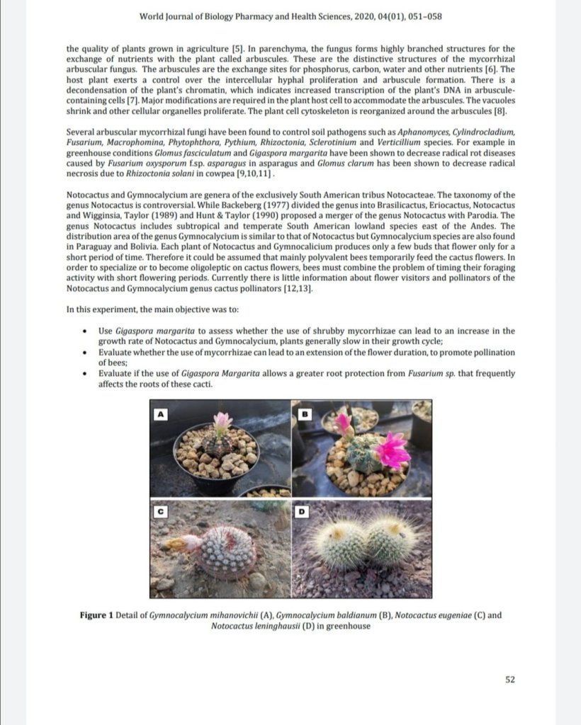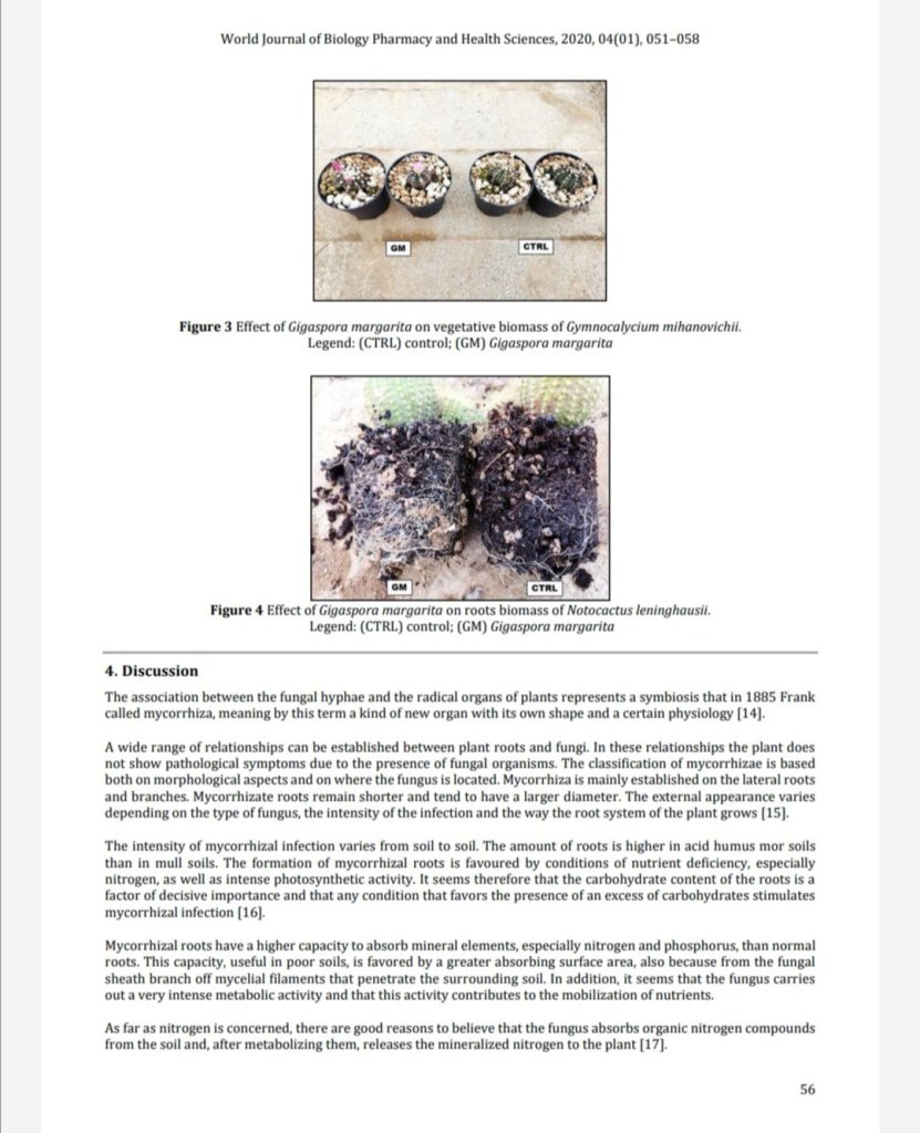 Objectives of the work were: i) use Gigaspora margarita to assess if the use of arbuscular mycorrhizae can lead to an increase in the growth rate of Notocactus and Gymnocalycium, plants generally slow in their growth cycle; ii) to evaluate if the use of mycorrhizae can lead to an extension of the duration of the flower, to promote pollination of bees; iii) to assess if the use of Gigaspora Margarita allows greater protection of the roots against the fungus Fusarium sp. which often affects the roots of these cacti. The two experimental groups in cultivation were: i) group without arbuscular michorriza, irrigated with water and substrate previously fertilized; group with Gigaspora Margarita, irrigated with water and substrate previously fertilized.