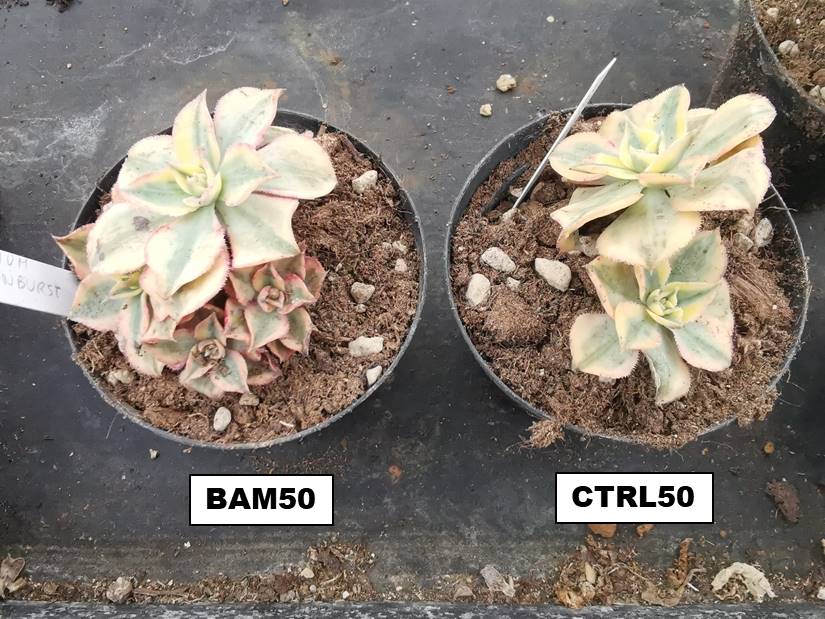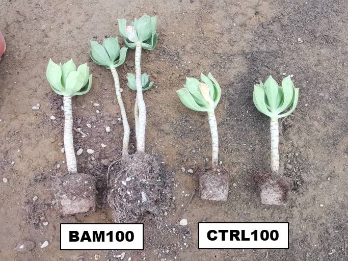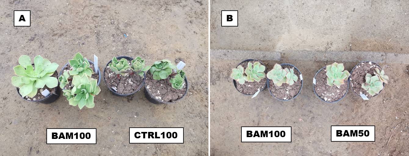 Abstract: In this work, the biostimulant and biocontrol capacity of Bacillus amyloliquefaciens in succulent plants such as Aeonium was evaluated. The specific objectives were in particular: (i) Evaluate whether the use of this bacterium can increase the growth rate of Aeonium plants that typically have a slow growth cycle; (ii) evaluate if the use of B. amyloliquefaciens can lead to increased plant resistance to Fusarium oxysporum; (iii) considered if utilization of B. amyloliquefaciens allows for increased plant resistance to water and nutrient stress. The experimentation showed a significant improvement of the agronomic parameters analyzed on all Aeonium plants treated with Bacillus amyloliquefaciens. In general there was a significant increase in plant height, number of leaves, vegetative and root weight, number of new shoots. In addition, Aeonium goochiae and sunburst show a better protection against the fungus Fusarium oxysporum. The trial also highlighted the ability of B. amyloliquefaciens to guarantee a productive and qualitative production of the plants even under conditions of reduced water and nutritional resources. Plants, thanks to the interaction with soil microorganisms, can reach higher nutrient and water resources, resulting in greater resistance to abiotic stresses and better quality in the cultivation cycle.