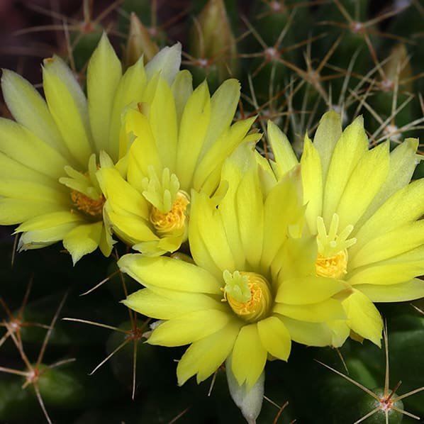 Sono presenti due distinti tipi: a fiori grandi e a fiori piccoli. Fusto dapprima basso e globulare diviene con l’età allungato fino a 10 cm, formato da un nucleo centrale e tubercoli allungati, conici, piuttosto morbidi. Ogni tubercolo presenta base lanosa, e un’areola apicale con circa 10 spine radiali sottili, bianche o crema, lunghe fino a 2 cm e 1-3 spine centrali dritte, più corte giallastre con la punta scura. Pianta che accestisce molto invecchiando, emettendo polloni basali e ramificando superiormente.