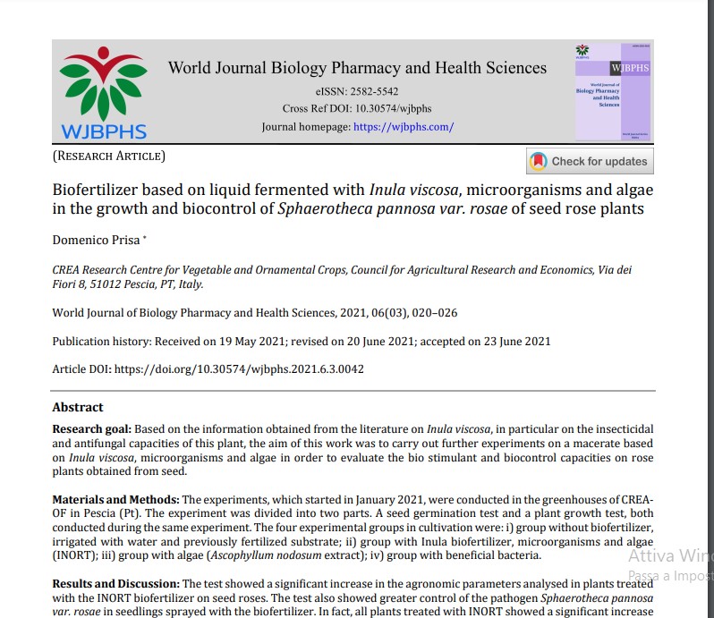 Abstract: Research goal: Based on the information obtained from the literature on Inula viscosa, in particular on the insecticidal and antifungal capacities of this plant, the aim of this work was to carry out further experiments on a macerate based on Inula viscosa, microorganisms and algae in order to evaluate the bio stimulant and biocontrol capacities on rose plants obtained from seed.Materials and Methods: The experiments, which started in January 2021, were conducted in the greenhouses of CREA-OF in Pescia (Pt). The experiment was divided into two parts. A seed germination test and a plant growth test, both conducted during the same experiment. The four experimental groups in cultivation were: i) group without biofertilizer, irrigated with water and previously fertilized substrate; ii) group with Inula biofertilizer, microorganisms and algae (INORT); iii) group with algae (Ascophyllum nodosum extract); iv) group with beneficial bacteria.Results and Discussion: The test showed a significant increase in the agronomic parameters analysed in plants treated with the INORT biofertilizer on seed roses. The test also showed greater control of the pathogen Sphaerotheca pannosa var. rosae in seedlings sprayed with the biofertilizer. In fact, all plants treated with INORT showed a significant increase in the height and number of leaves per plant, in the vegetative and root weight of the plants, in the number and duration of flowers, a reduction in the attack of the pathogen Sphaerotheca pannosa var. rosae, an increase in seed germination and a reduction in the average germination time.Conclusions: The experiment at CREA-OF in Pescia has therefore demonstrated how the application of a macerate based on Inula viscosa, microorganisms and algae can significantly improve the cultivation and quality of seed rose plants. As in other experiments, the application of this biostimulant also determined positive effects in the control of pathogenic fungi, in particular Sphaerotheca pannosa var. rosae. Other investigations are currently underway to study the biostimulant and desiccant capacities of the Inula plant, depending on the harvesting methods, the physiological state of the plants, the extraction method, the type of culture medium, the type and timing of maceration. The association with various microbial consortia and other plant-derived biostimulants will also be evaluated.