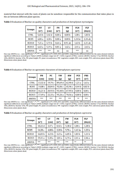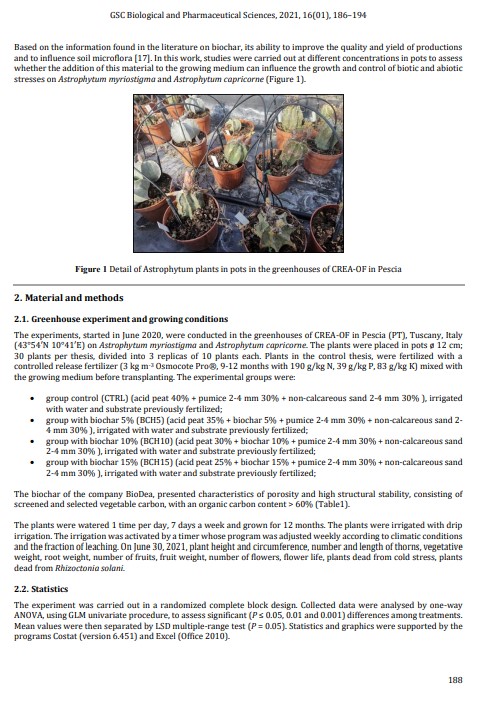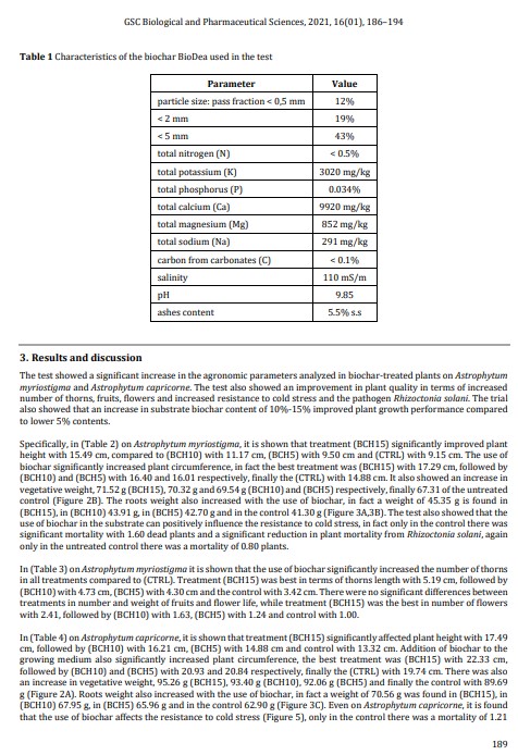 Results and Discussion: The test showed a significant increase in the agronomic parameters analyzed in biochar-treated plants on Astrophytum myriostigma and Astrophytum capricorne. The test also showed an improvement in plant quality in terms of increased number of thorns, fruits, flowers and increased resistance to cold stress and the pathogen Rhizoctonia solani. The trial also showed that an increase in substrate biochar content of 10%-15% improved plant growth performance compared to lower 5% contents.