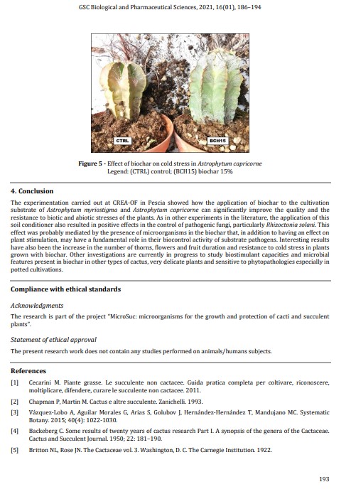 Conclusions: The experimentation carried out at CREA-OF in Pescia showed how the application of biochar to the cultivation substrate of Astrophytum myriostigma and Astrophytum capricorne can significantly improve the quality and the resistance to biotic and abiotic stresses of the plants. As in other experiments in the literature, the application of this soil conditioner also resulted in positive effects in the control of pathogenic fungi, particularly Rhizoctonia solani. This effect was probably mediated by the presence of microorganisms in the biochar that, in addition to having an effect on plant stimulation, may have a fundamental role in their biocontrol activity of substrate pathogens. Interesting results have also been the increase in the number of thorns, flowers and fruit duration and resistance to cold stress in plants grown with biochar.