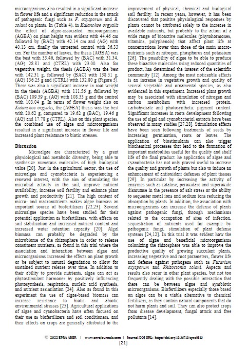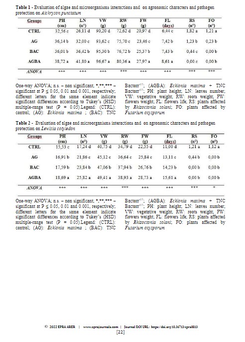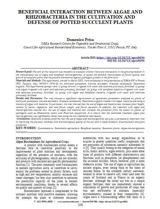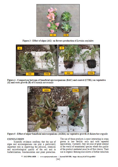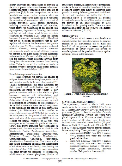 Research goal: The aim of this research was therefore to evaluate whether there are interactions in the growing medium in the simultaneous use of algae and beneficial microorganisms, to assess the possible improvement of flower quality and growth of succulent plants and the possible bioncontrol against pathogens present in the farm soils. Materials and Methods: The experiments, started in March 2021, were conducted in the greenhouses of CREA-OF in Pescia (PT), Tuscany, Italy (43°54′N 10°41′E) on Aichryson punctatum, Lewisia cotyledon, Crassula sarcocaulis, Kalanchoe orgyalis. The experimental groups were: i) group control, irrigated with water and substrate previously fertilized; ii) group with algae irrigated with water and substrate previously fertilized; iii) group with beneficial bacteria irrigated with water and substrate previously fertilized; iv) group with algae and beneficial bacteria irrigated with water and substrate previously fertilized. Results and Discussion: The trial showed a significant improvement of agronomic parameters analyzed on plants of Aichryson punctatum, Lewisia cotyledon, Crassula sarcocaulis, Kalanchoe orgyalis treated with algae, bacteria and using a mixture of algae with bacteria. In particular, the trial showed that the use of algae and bacteria can increase plant height, number of leaves, vegetative, root and flower weight, and flower duration. In addition, the treatment with algae and microorganisms showed how the use of algae and bacteria can increase the protection from the attack on plants, of pathogens such as Rhizoctonia solani and Fusarium oxysporum. It is shown that the combined treatment algae plus microorganisms was significantly better than using the two treatments individually. Conclusions: Scientific evidence confirms that the use of algae and microorganisms can play a particularly important role in improving the physical, chemical and microbiological quality of the soil and in biofertilization, biostimulation and plant protection.