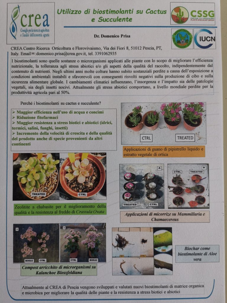 Un poster sui diversi studi che il dr. Prisa sta portando avanti su Cactus e Succulente con l’utilizzo di prodotti innovativi Biostimolanti