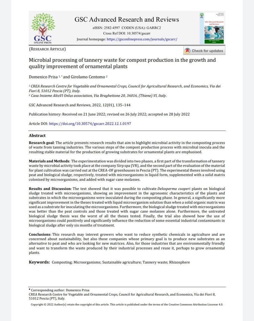 Materials and Methods: The experimentation was divided into two phases, a first part of the transformation of tannery waste by microbial activity took place at the company Sirp spa (VR), and the second part of the evaluation of the material for plant cultivation was carried out at the CREA-OF greenhouses in Pescia (PT). The experimental theses involved using peat and biological sludge, respectively, treated with microorganisms in liquid form, supplemented with a solid matrix colonised by microorganisms, and added with sugar cane molasses.