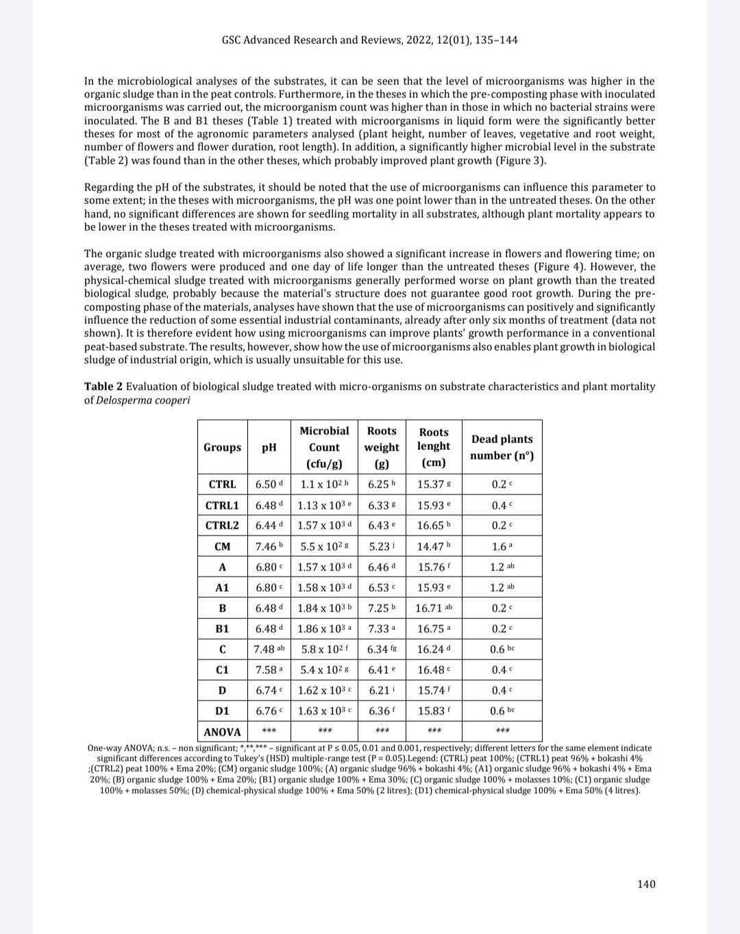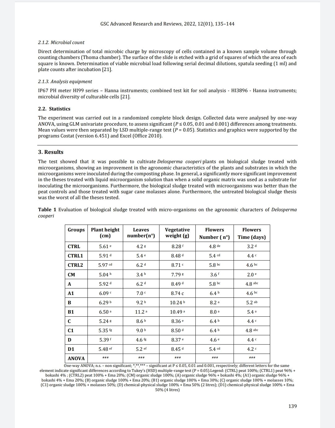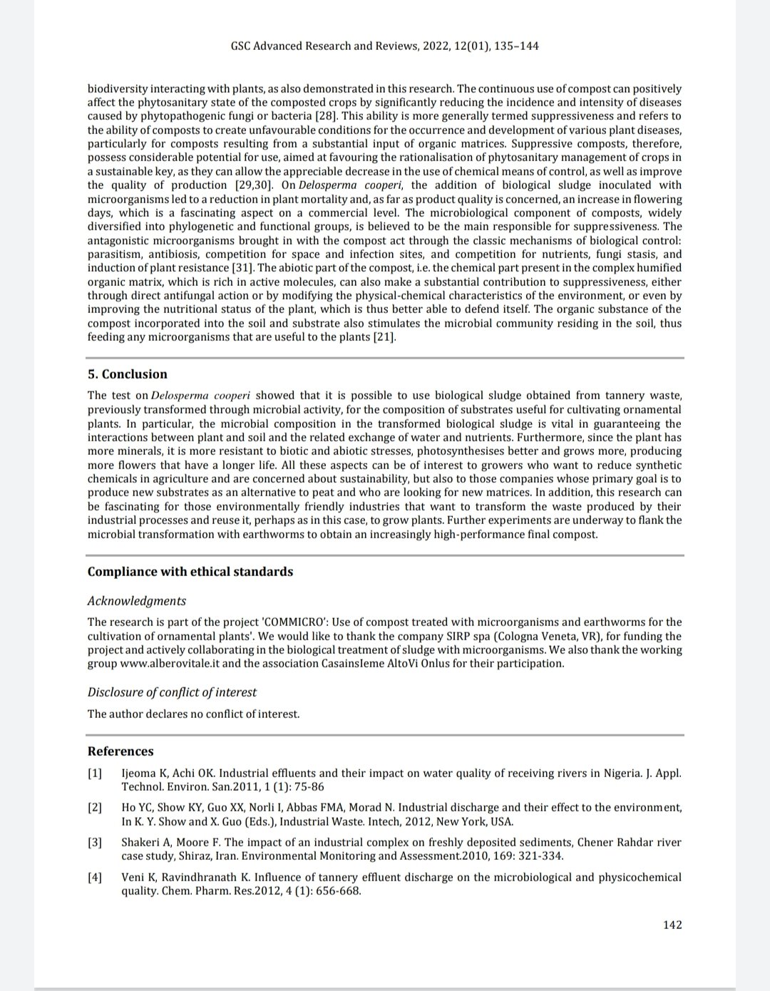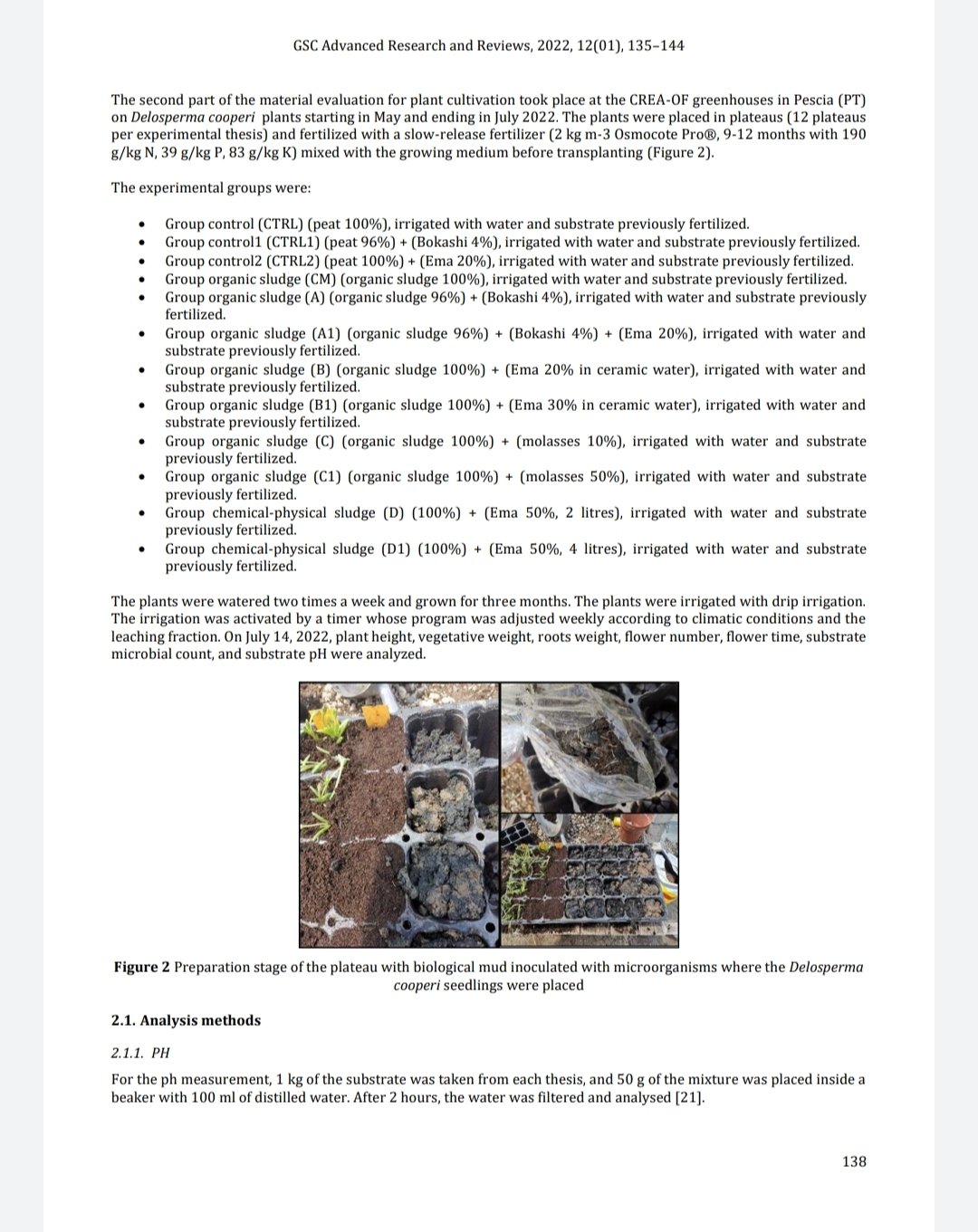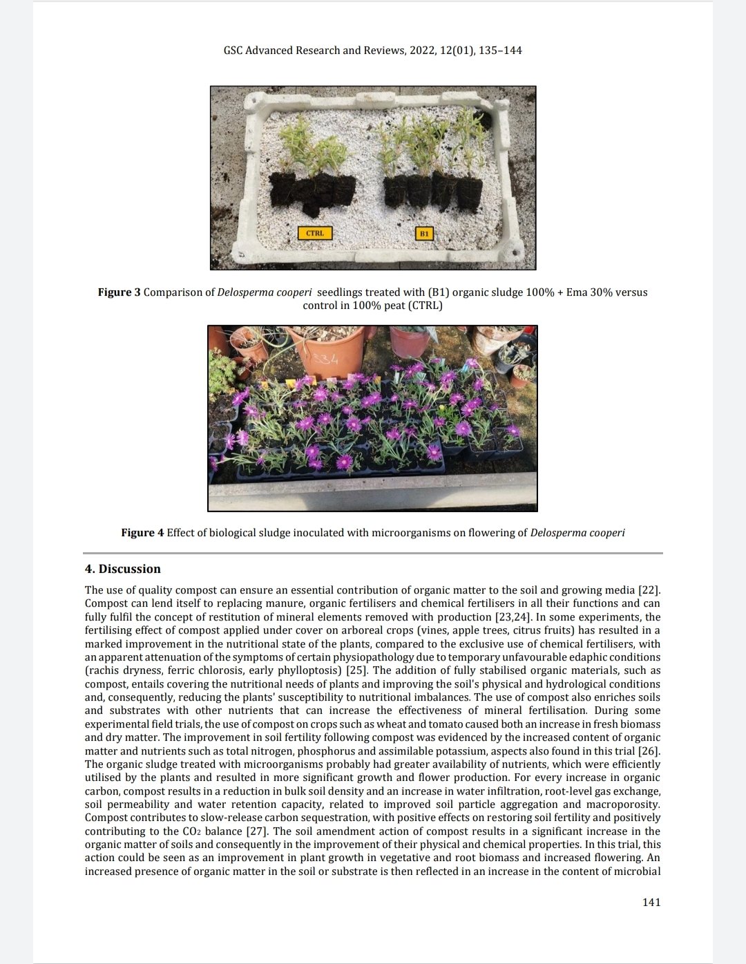 Results and Discussion: The test showed that it was possible to cultivate Delosperma cooperi plants on biological sludge treated with microorganisms, showing an improvement in the agronomic characteristics of the plants and substrates in which the microorganisms were inoculated during the composting phase. In general, a significantly more significant improvement in the theses treated with liquid microorganism solution than when a solid organic matrix was used as a substrate for inoculating the microorganisms. Furthermore, the biological sludge treated with microorganisms was better than the peat controls and those treated with sugar cane molasses alone. Furthermore, the untreated biological sludge thesis was the worst of all the theses tested. Finally, the trial also showed how the use of microorganisms could positively and significantly influence the reduction of some essential industrial contaminants in biological sludge after only six months of treatment.