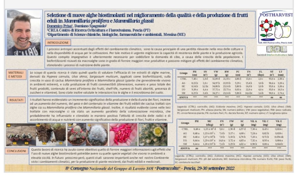 Oggi a Pescia all’8 Convegno di Post-harvest presenterò due miei nuovi lavori. Uno effettuato con il mio amico Damiano Spagnuolo dell’Università di Messina per la selezione di nuove alghe stimolanti del lago di Ganzirri (Me), da utilizzare come stimolanti di specie cactacee eduli