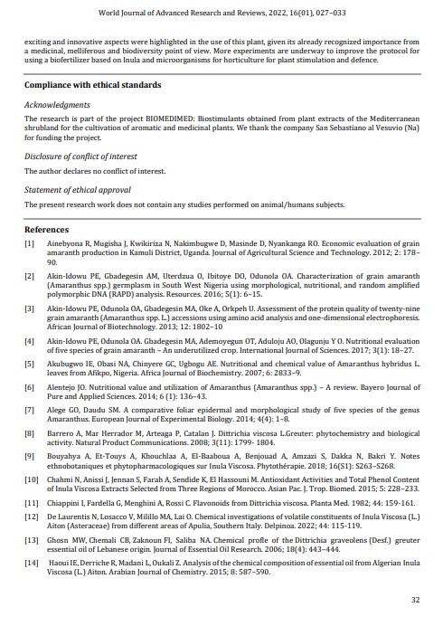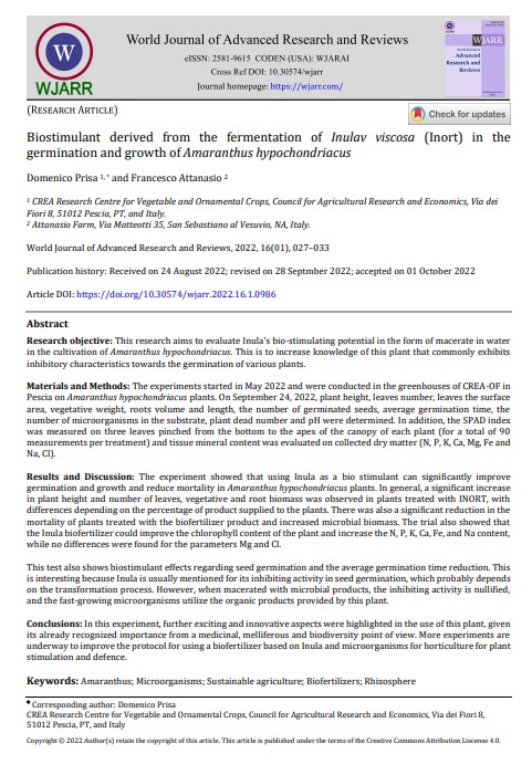 Conclusions: In this experiment, further exciting and innovative aspects were highlighted in the use of this plant, given its already recognized importance from a medicinal, melliferous and biodiversity point of view. More experiments are underway to improve the protocol for using a biofertilizer based on Inula and microorganisms for horticulture for plant stimulation and defence.
