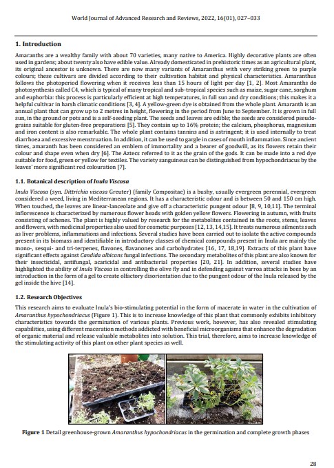 Research objective: This research aims to evaluate Inula’s bio-stimulating potential in the form of macerate in water in the cultivation of Amaranthus hypochondriacus. This is to increase knowledge of this plant that commonly exhibits inhibitory characteristics towards the germination of various plants.
