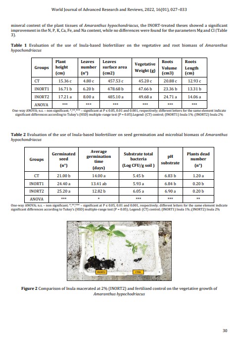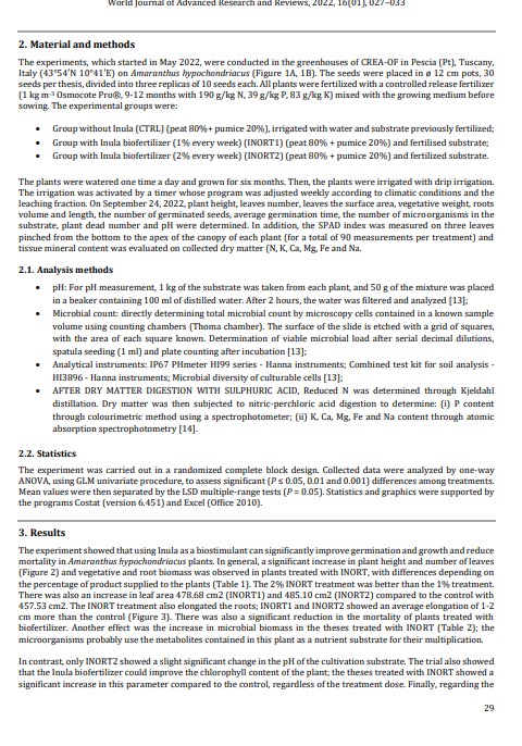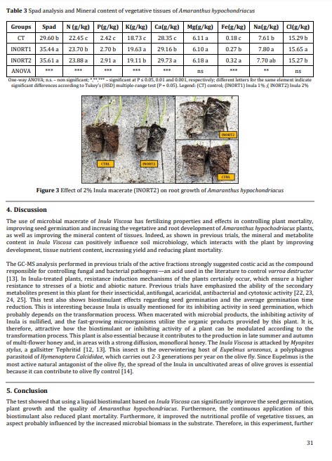 Results and Discussion: The experiment showed that using Inula as a bio stimulant can significantly improve germination and growth and reduce mortality in Amaranthus hypochondriacus plants. In general, a significant increase in plant height and number of leaves, vegetative and root biomass was observed in plants treated with INORT, with differences depending on the percentage of product supplied to the plants. There was also a significant reduction in the mortality of plants treated with the biofertilizer product and increased microbial biomass. The trial also showed that the Inula biofertilizer could improve the chlorophyll content of the plant and increase the N, P, K, Ca, Fe, and Na content, while no differences were found for the parameters Mg and Cl.