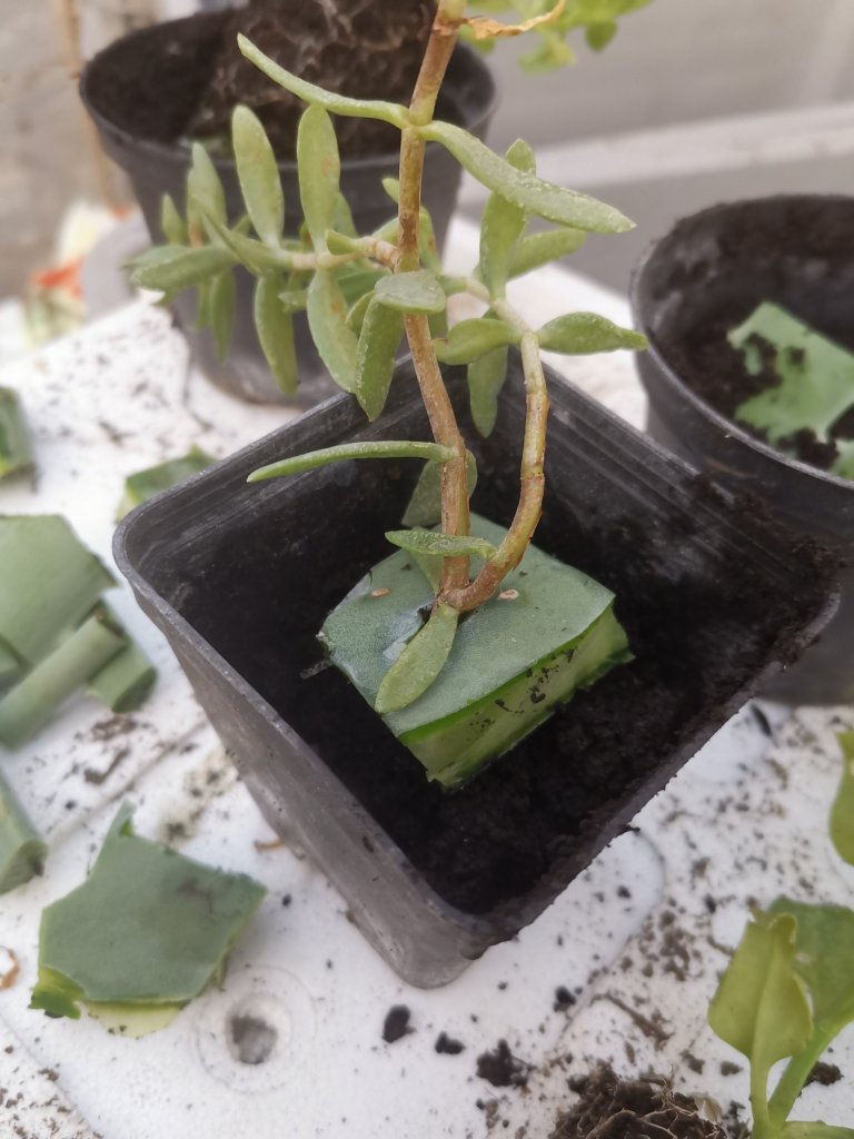 Si fanno i cubetti, si fa un buco centrale, s’inserisce il margine tagliato della talea, si mette in substrato a radicare.