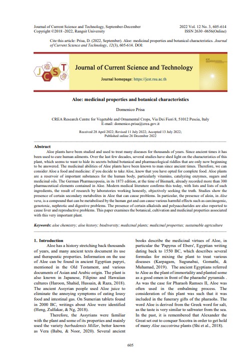 Aloe plants have been studied and used to treat many diseases for thousands of years. Since ancient times it has been used to cure human ailments. Over the last few decades, several studies have shed light on the characteristics of this plant, which seems to want to hide its secrets behind botanical and pharmacological riddles that are only now beginning to be answered. The medicinal abilities of Aloe plants have been known to man since ancient times. Therefore, we can consider Aloe a food and medicine: if you decide to take Aloe, know that you have opted for complete food. Aloe plants are a reservoir of important substances for the human body, particularly vitamins, catalyzing enzymes, sugars and medicinal oils. The German Pharmacopoeia, in its 1873 edition, at the time of Bismark, already recorded more than 300 pharmaceutical elements contained in Aloe. Modern medical literature confirms this today, with lists and lists of such ingredients, the result of research by laboratories working honestly, objectively seeking the truth. Studies show the presence of certain secondary metabolites in Aloe that can cause problems. In particular, the presence of aloin, in Aloe vera, is a compound that can be metabolised by the human gut and can cause various harmful effects such as carcinogenic, genotoxic, nephrotic and digestive problems. The presence of certain alkaloids and polysaccharides are also reported to cause liver and reproductive problems. This paper examines the botanical, cultivation and medicinal properties associated with this very important plant.