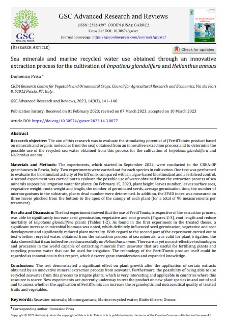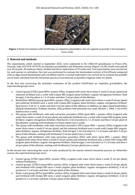 Research objective: The aim of this research was to evaluate the stimulating potential of (FertilTomix: product based on minerals and organic molecules from the sea) obtained from an innovative extraction process and to determine the possible use of the recycled sea water obtained from this process for the cultivation of Impatiens glandulifera and Helianthus annuus.