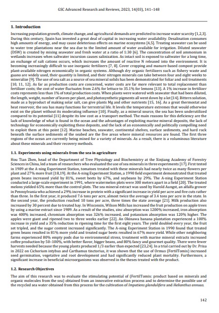 Conclusions: The test demonstrated a significant effect on plant growth after the application of certain extracts obtained by an innovative mineral extraction process from seawater. Furthermore, the possibility of being able to use recycled seawater from this process to irrigate plants, which is very interesting and applicable in countries where this resource is scarce. New experiments are currently underway to test the product on new plant species in and out of soil and to assess whether the application of FertilTomix can increase the organoleptic and nutraceutical quality of treated fruits and vegetables.