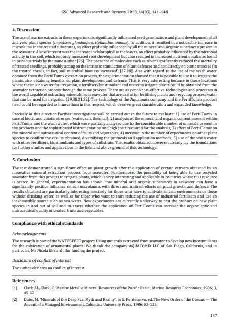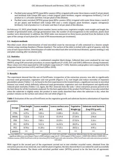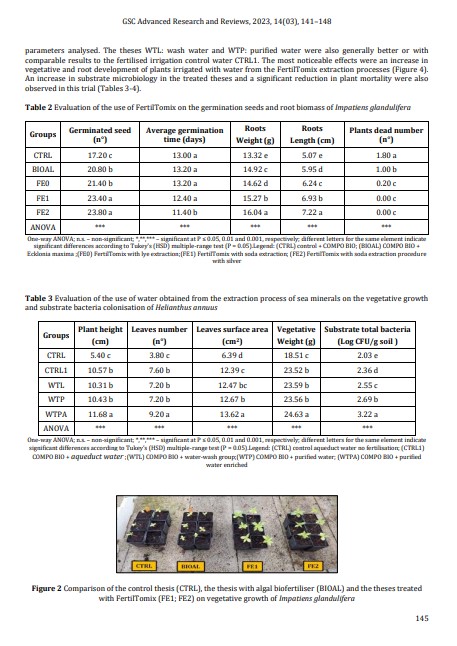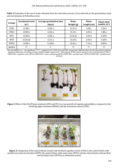 Results and Discussion: The first experiment showed that the use of FertilTomix, irrespective of the extraction process, was able to significantly increase seed germination, vegetative and root growth (Figures 2-3), root length and reduce mortality of Impatiens glandulifera plants (Tables 1-2). As found in the first experiment in the treated theses, a significant increase in microbial biomass was noted, which definitely influenced seed germination, vegetative and root development and significantly reduced plant mortality. With regard to the second part of the experiment carried out to test whether recycled water, obtained from the extraction process of sea minerals, was valid for plant irrigation, the data showed that it can indeed be used successfully on Helianthus annuus. There are as yet no cost-effective technologies and processes in the world capable of extracting minerals from seawater that are useful for fertilising plants and recycling process water that can be used for irrigation. The technology of the FertilTomix product itself could be regarded as innovations in this respect, which deserve great consideration and expanded knowledge.