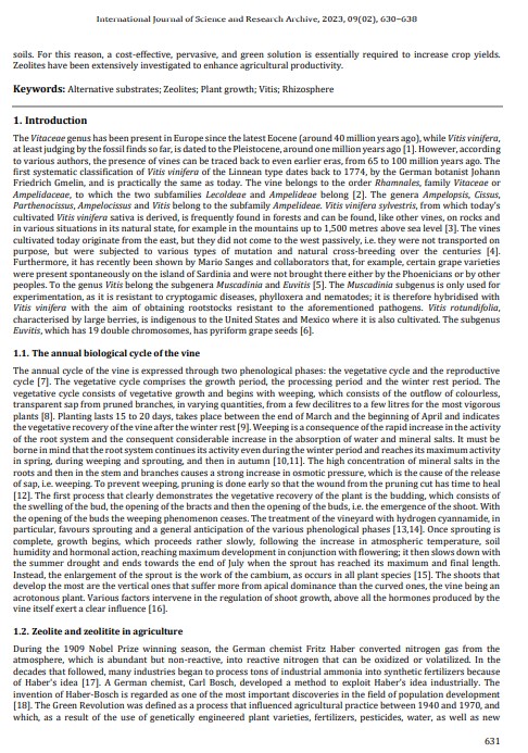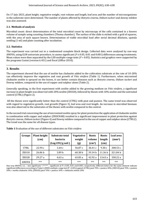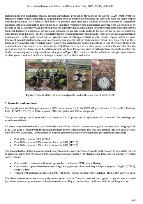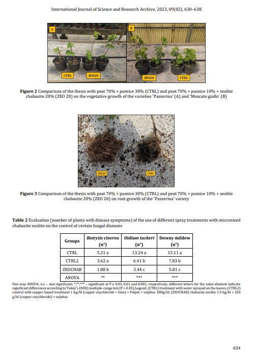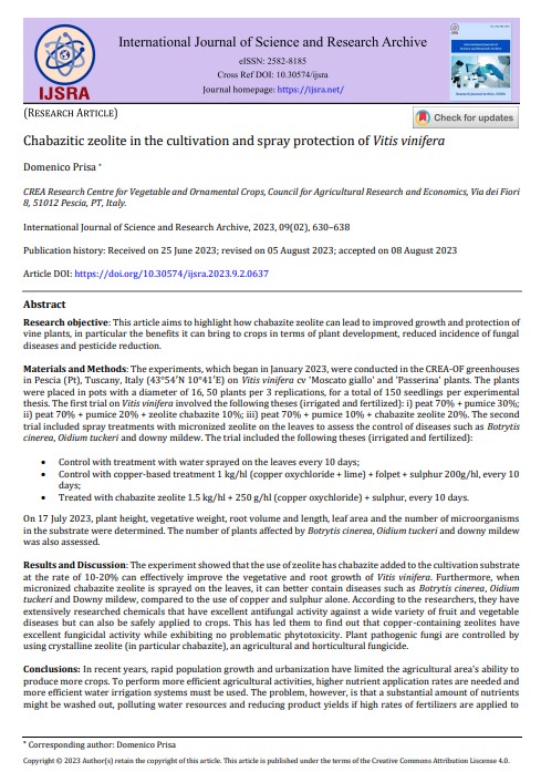 Research objective: This article aims to highlight how chabazite zeolite can lead to improved growth and protection of vine plants, in particular the benefits it can bring to crops in terms of plant development, reduced incidence of fungal diseases and pesticide reduction.Materials and Methods: The experiments, which began in January 2023, were conducted in the CREA-OF greenhouses in Pescia (Pt), Tuscany, Italy (43°54′N 10°41′E) on Vitis vinifera cv ‘Moscato giallo’ and ‘Passerina’ plants. The plants were placed in pots with a diameter of 16, 50 plants per 3 replications, for a total of 150 seedlings per experimental thesis. The first trial on Vitis vinifera involved the following theses (irrigated and fertilized): i) peat 70% + pumice 30%; ii) peat 70% + pumice 20% + zeolite chabazite 10%; iii) peat 70% + pumice 10% + chabazite zeolite 20%. The second trial included spray treatments with micronized zeolite on the leaves to assess the control of diseases such as Botrytis cinerea, Oidium tuckeri and downy mildew. The trial included the following theses (irrigated and fertilized):· Control with treatment with water sprayed on the leaves every 10 days;· Control with copper-based treatment 1 kg/hl (copper oxychloride + lime) + folpet + sulphur 200g/hl, every 10 days;· Treated with chabazite zeolite 1.5 kg/hl + 250 g/hl (copper oxychloride) + sulphur, every 10 days.On 17 July 2023, plant height, vegetative weight, root volume and length, leaf area and the number of microorganisms in the substrate were determined. The number of plants affected by Botrytis cinerea, Oidium tuckeri and downy mildew was also assessed.Results and Discussion: The experiment showed that the use of zeolite has chabazite added to the cultivation substrate at the rate of 10-20% can effectively improve the vegetative and root growth of Vitis vinifera. Furthermore, when micronized chabazite zeolite is sprayed on the leaves, it can better contain diseases such as Botrytis cinerea, Oidium tuckeri and Downy mildew, compared to the use of copper and sulphur alone. According to the researchers, they have extensively researched chemicals that have excellent antifungal activity against a wide variety of fruit and vegetable diseases but can also be safely applied to crops. This has led them to find out that copper-containing zeolites have excellent fungicidal activity while exhibiting no problematic phytotoxicity. Plant pathogenic fungi are controlled by using crystalline zeolite (in particular chabazite), an agricultural and horticultural fungicide.Conclusions: In recent years, rapid population growth and urbanization have limited the agricultural area’s ability to produce more crops. To perform more efficient agricultural activities, higher nutrient application rates are needed and more efficient water irrigation systems must be used. The problem, however, is that a substantial amount of nutrients might be washed out, polluting water resources and reducing product yields if high rates of fertilizers are applied to soils. For this reason, a cost-effective, pervasive, and green solution is essentially required to increase crop yields. Zeolites have been extensively investigated to enhance agricultural productivity.
