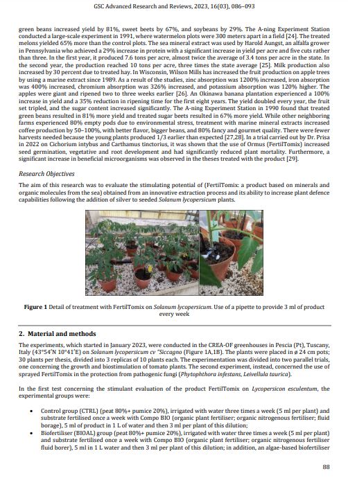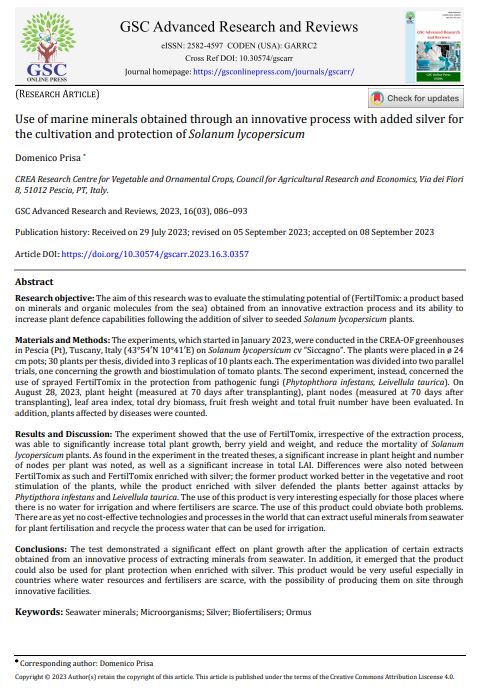 Research objective: The aim of this research was to evaluate the stimulating potential of (FertilTomix: a product based on minerals and organic molecules from the sea) obtained from an innovative extraction process and its ability to increase plant defence capabilities following the addition of silver to seeded Solanum lycopersicum plants.