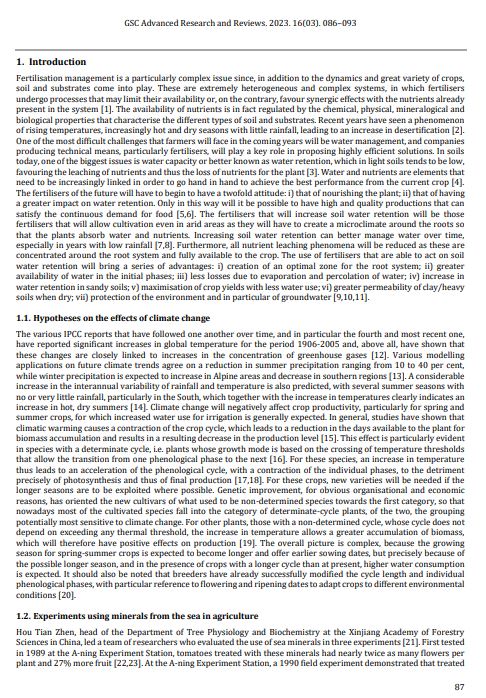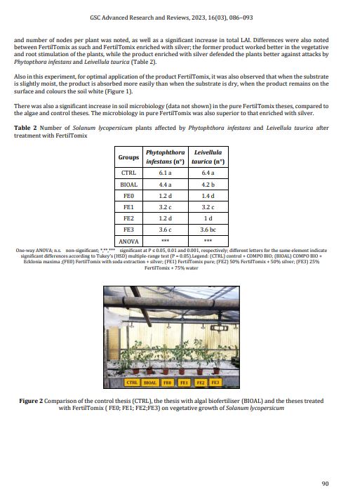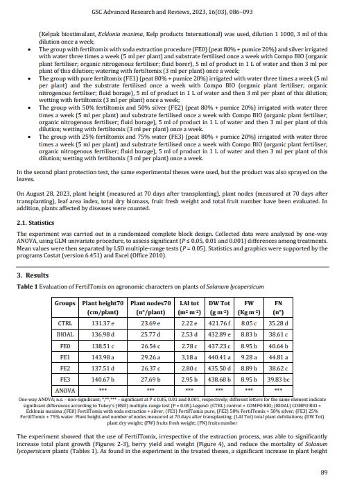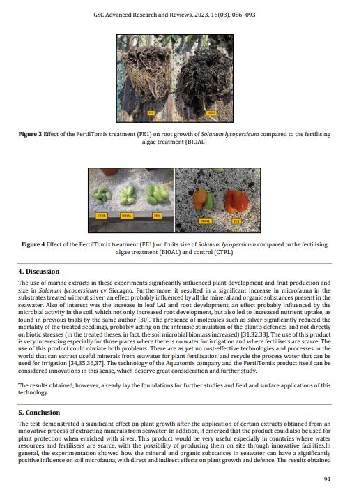 Results and Discussion: The experiment showed that the use of FertilTomix, irrespective of the extraction process, was able to significantly increase total plant growth, berry yield and weight, and reduce the mortality of Solanum lycopersicum plants. As found in the experiment in the treated theses, a significant increase in plant height and number of nodes per plant was noted, as well as a significant increase in total LAI. Differences were also noted between FertilTomix as such and FertilTomix enriched with silver; the former product worked better in the vegetative and root stimulation of the plants, while the product enriched with silver defended the plants better against attacks by Phytipthora infestans and Leivellula taurica. The use of this product is very interesting especially for those places where there is no water for irrigation and where fertilisers are scarce. The use of this product could obviate both problems. There are as yet no cost-effective technologies and processes in the world that can extract useful minerals from seawater for plant fertilisation and recycle the process water that can be used for irrigation.