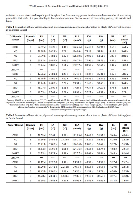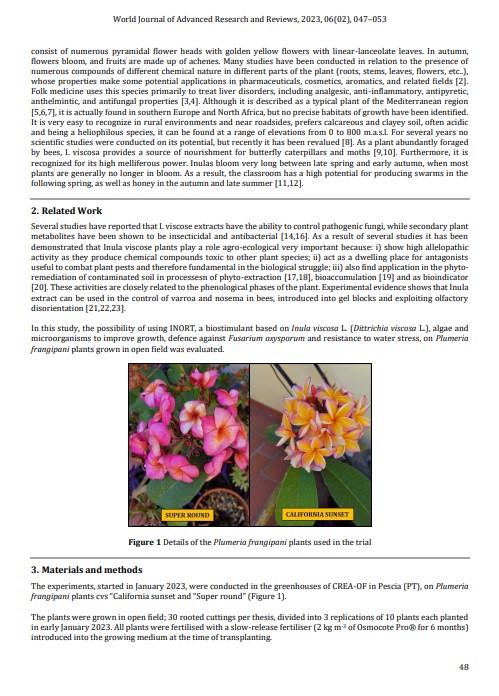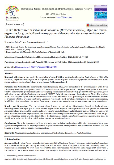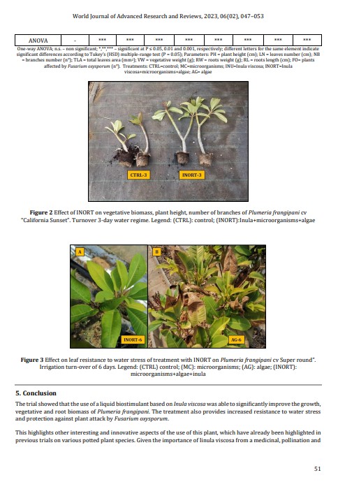 Results and Discussion: The experiment showed that the use of the biostimulant based on Inula viscosa, microorganisms and algae (INORT) can indeed significantly improve the vegetative and root growth of Plumeria frangipani plants grown in the open field. Improvements were also found in plant height, number of leaves, number of floral branches, leaf area, vegetative and root biomass and root length at different irrigation frequencies of 3 and 6 days. A very interesting aspect was also the ability of the biostimulant based on Inula viscosa, microorganisms and algae to significantly reduce the incidence of Fusarium oxysporum attacks on leaves.
