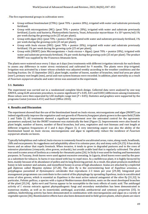 Materials and Methods: The experiments, started in January 2023, were conducted in the greenhouses of CREA-OF in Pescia (Pt), on Plumeria frangipani plants cvs “California sunset and “Super round”. The plants were grown in open field. The five experimental groups in cultivation were: group without biostimulant (CTRL); group with microrganisms; group with algae; group with Inula viscosa; group with (INORT) (mix Microorganisms + Inula viscosa + Algae).The product INORT was supplied by the Francesco Attanasio farm. On 15 September 2023, plant height, number of leaves, number of branches, total leaf area per plant (mm2), primary root length (mm), aerial and root system biomass were recorded. In addition, plant mortality as a result of Fusarium oxysporum attacks and water stress was assessed in the experiment.