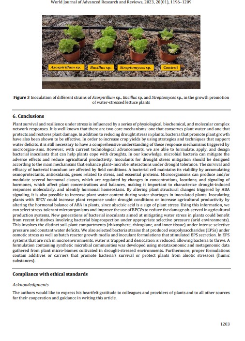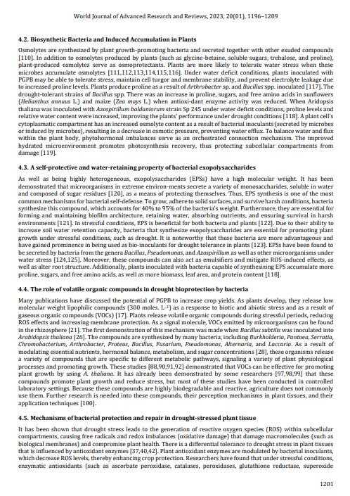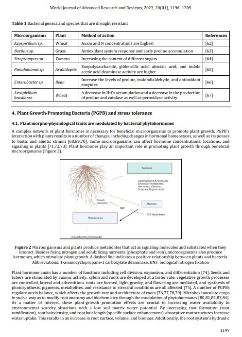 Temperature, rain, humidity, wind, and solar radiation are all climatic factors that affect agricultural activities. While some agricultural areas of the world are irrigated, the vast majority rely on natural rainfall patterns. Farmers will consume more water as a result of climate change and experience less water availability, resulting in a decrease in production capacity. As one of the most important natural phenomena affecting agricultural productivity, drought is a limiting environment for plant growth. Bacteria have been shown to reduce water stress in these plant species and promote greater growth by regulating gene expression and the integration of hormones. Phytohormones modulation, stress-induced enzymatic apparatus, and metabolites are integrated into the root-to-shoot phenotypic changes in growth rate, architecture, hydraulic conductivity, water conservation, plant cell protection, and damage restoration. By demonstrating how plant growth-promoting bacteria can mitigate plant stress and provide examples of technology conversion in agroecosystems, this review illustrates how water stress can be mitigated.