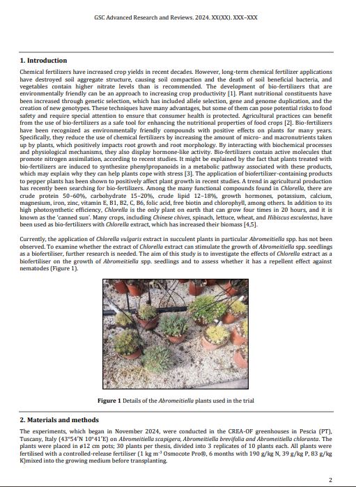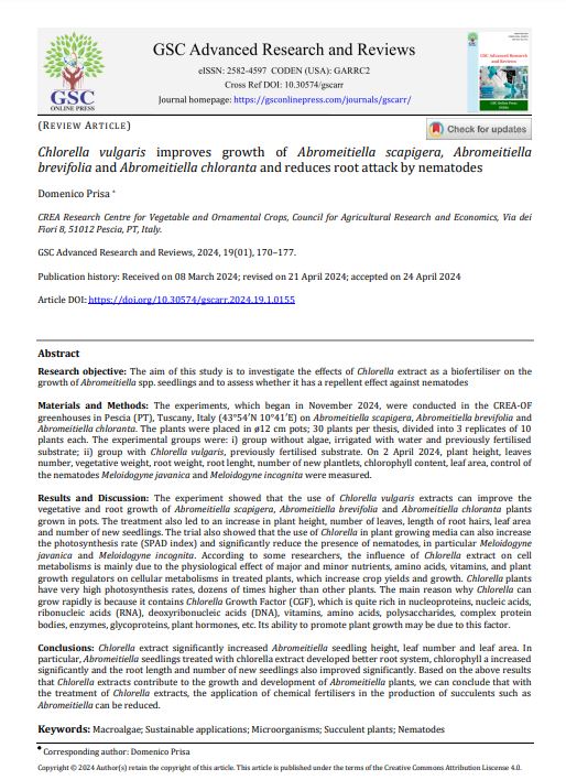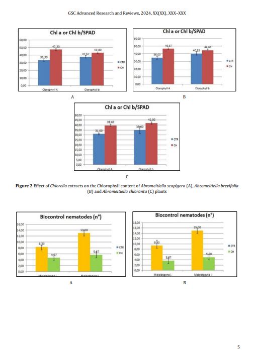 Materials and Methods: The experiments, which began in November 2024, were conducted in the CREA-OF greenhouses in Pescia (PT), Tuscany, Italy (43°54′N 10°41′E) on Abromeitiella scapigera, Abromeitiella brevifolia and Abromeitiella chloranta. The plants were placed in ø12 cm pots; 30 plants per thesis, divided into 3 replicates of 10 plants each. The experimental groups were: i) group without algae, irrigated with water and previously fertilised substrate; ii) group with Chlorella vulgaris, previously fertilised substrate. On 2 April 2024, plant height, leaves number, vegetative weight, root weight, root lenght, number of new plantlets, chlorophyll content, leaf area, control of the nematodes Meloidogyne javanica and Meloidogyne incognita were measured.