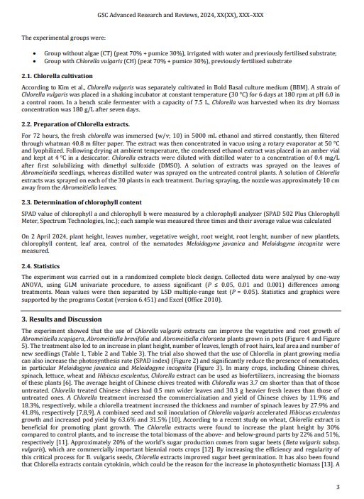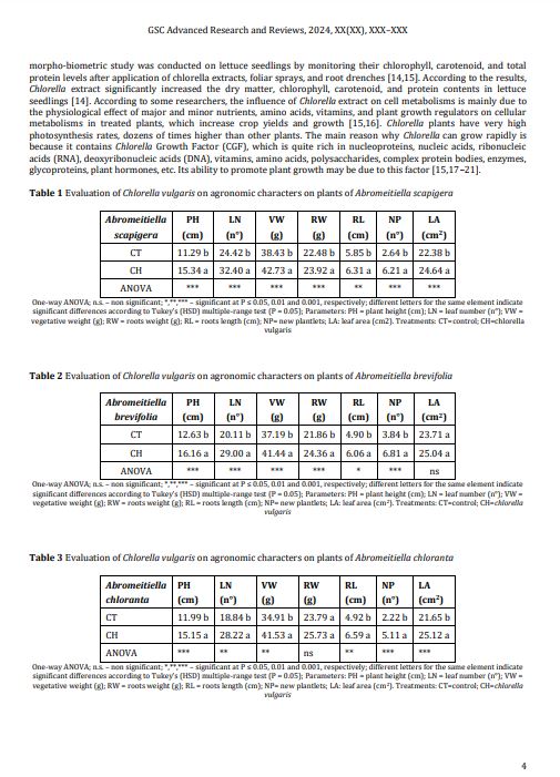 Results and Discussion: The experiment showed that the use of Chlorella vulgaris extracts can improve the vegetative and root growth of Abromeitiella scapigera, Abromeitiella brevifolia and Abromeitiella chloranta plants grown in pots. The treatment also led to an increase in plant height, number of leaves, length of root hairs, leaf area and number of new seedlings. The trial also showed that the use of Chlorella in plant growing media can also increase the photosynthesis rate (SPAD index) and significantly reduce the presence of nematodes, in particular Meloidogyne javanica and Meloidogyne incognita. According to some researchers, the influence of Chlorella extract on cell metabolisms is mainly due to the physiological effect of major and minor nutrients, amino acids, vitamins, and plant growth regulators on cellular metabolisms in treated plants, which increase crop yields and growth. Chlorella plants have very high photosynthesis rates, dozens of times higher than other plants. The main reason why Chlorella can grow rapidly is because it contains Chlorella Growth Factor (CGF), which is quite rich in nucleoproteins, nucleic acids, ribonucleic acids (RNA), deoxyribonucleic acids (DNA), vitamins, amino acids, polysaccharides, complex protein bodies, enzymes, glycoproteins, plant hormones, etc. Its ability to promote plant growth may be due to this factor.