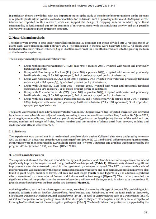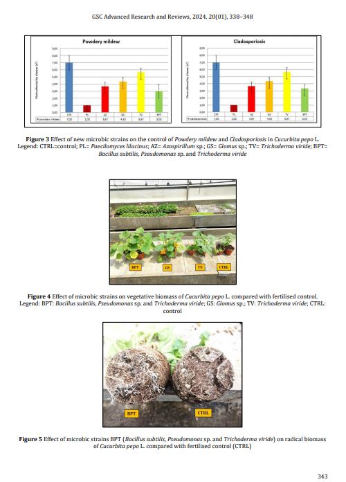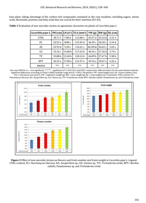 Materials and Methods: The plants were grown in pots under controlled conditions; 30 seedlings per thesis, divided into 3 replications of 10 plants each, were planted in early February 2024. The plants used in the trial were Cucurbita pepo L.. The six experimental groups in cultivation were: i) group without microorganisms, irrigated with water and previously fertilised substrate; ii) group with Paecilomyces lilacinus, irrigated with water and previously fertilised substrate, (4.5 x 106 spores/ml), 5ml of product sprayed per kg of substrate; iii) group with Azospirillum sp., irrigated with water and previously fertilised substrate, (4 x 108 spores/g), 1g of mixed product per kg of substrate; iv) group with Glomus sp., irrigated with water and previously fertilised substrate, (3 x 109 spores/g), 1g of mixed product per kg of substrate; v) group with Trichoderma viride, irrigated with water and previously fertilised substrate, (3.6 x 108 spores/ml), 5ml of product sprayed per kg of substrate; vi) group with mix Bacillus subtilis, Pseudomonas sp. and Trichoderma viride, irrigated with water and previously fertilised substrate, (2.3 x 108 spores/ml) 5 ml of product sprayed per kg of substrate. On 5 June 2024, plant height, number of leaves, total leaf area per plant (mm2), primary root length (mm), biomass of the aerial and root system, number and weight of fruits, flowers number and the number of plants dead from powdery mildew and cladosporiosis attacks were recorded.