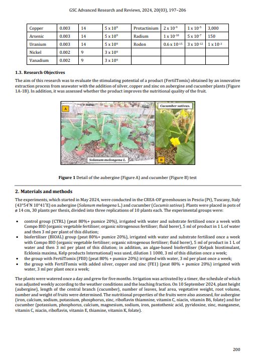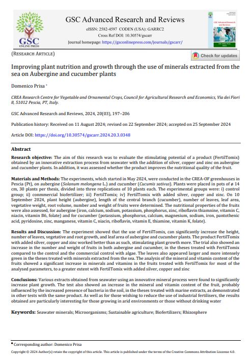 Research objective: The aim of this research was to evaluate the stimulating potential of a product (FertilTomix) obtained by an innovative extraction process from seawater with the addition of silver, copper and zinc on aubergine and cucumber plants. In addition, it was assessed whether the product improves the nutritional quality of the fruit.