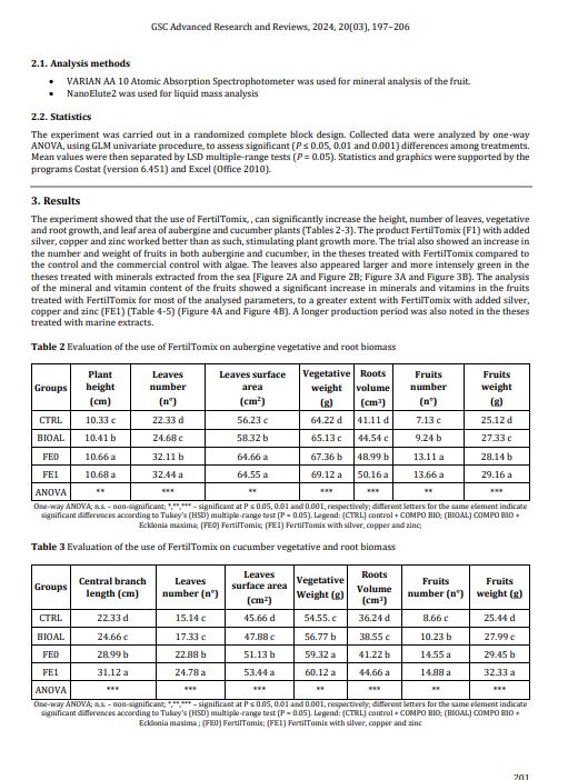 Results and Discussion: The experiment showed that the use of FertilTomix, can significantly increase the height, number of leaves, vegetative and root growth, and leaf area of aubergine and cucumber plants. The product FertilTomix with added silver, copper and zinc worked better than as such, stimulating plant growth more. The trial also showed an increase in the number and weight of fruits in both aubergine and cucumber, in the theses treated with FertilTomix compared to the control and the commercial control with algae. The leaves also appeared larger and more intensely green in the theses treated with minerals extracted from the sea. The analysis of the mineral and vitamin content of the fruits showed a significant increase in minerals and vitamins in the fruits treated with FertilTomix for most of the analysed parameters, to a greater extent with FertilTomix with added silver, copper and zinc