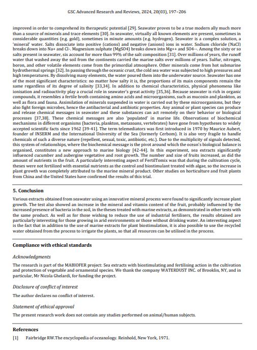 Conclusions: Various extracts obtained from seawater using an innovative mineral process were found to significantly increase plant growth. The test also showed an increase in the mineral and vitamin content of the fruit, probably influenced by the increased presence of bacteria in the soil, in the theses treated with marine extracts, as demonstrated in other tests with the same product. As well as for those wishing to reduce the use of industrial fertilisers, the results obtained are particularly interesting for those growing in arid environments or those without drinking water