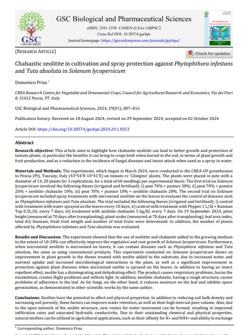 Research objective: This article aims to highlight how chabazite zeolitite can lead to better growth and protection of tomato plants, in particular the benefits it can bring to crops both when buried in the soil, in terms of plant growth and fruit production, and as a reduction in the incidence of fungal diseases and insect attack when used as a spray in water.