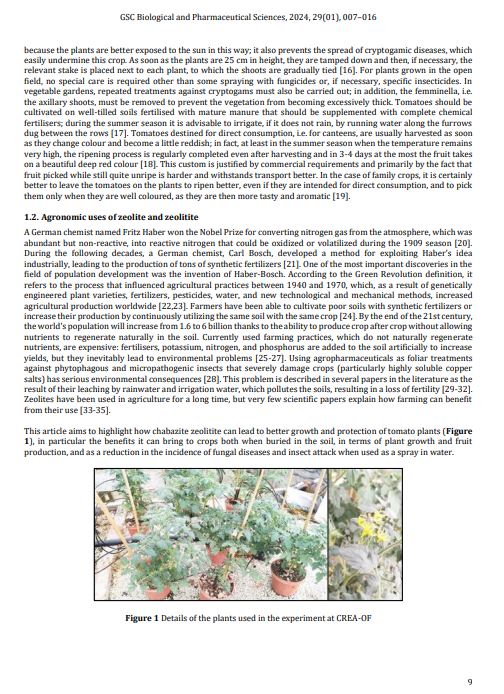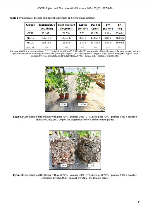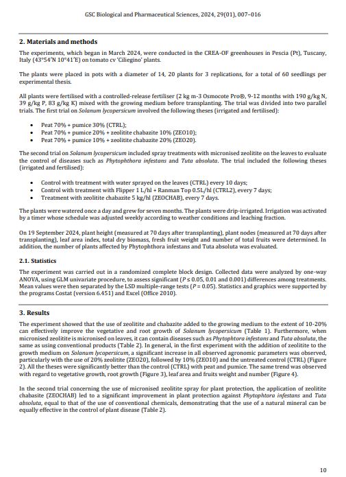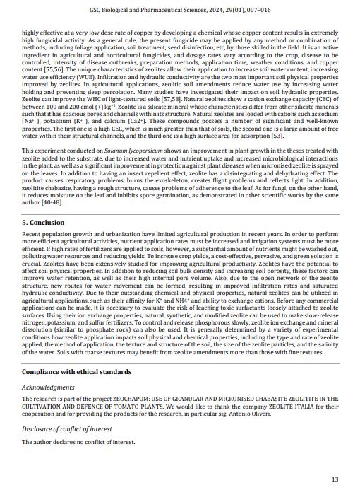Results and Discussion: The experiment showed that the use of zeolitite and chabazite added to the growing medium to the extent of 10-20% can effectively improve the vegetative and root growth of Solanum lycopersicum. Furthermore, when micronised zeolitite is micronised on leaves, it can contain diseases such as Phytophtora infestans and Tuta absoluta, the same as using conventional products. This experiment conducted on Solanum lycopersicum shows an improvement in plant growth in the theses treated with zeolite added to the substrate, due to increased water and nutrient uptake and increased microbiological interactions in the plant, as well as a significant improvement in protection against plant diseases when micronised zeolite is sprayed on the leaves. In addition to having an insect repellent effect, zeolite has a disintegrating and dehydrating effect. The product causes respiratory problems, burns the exoskeleton, creates flight problems and reflects light. In addition, zeolitite chabazite, having a rough structure, causes problems of adherence to the leaf. As for fungi, on the other hand, it reduces moisture on the leaf and inhibits spore germination, as demonstrated in other scientific works by the same author.