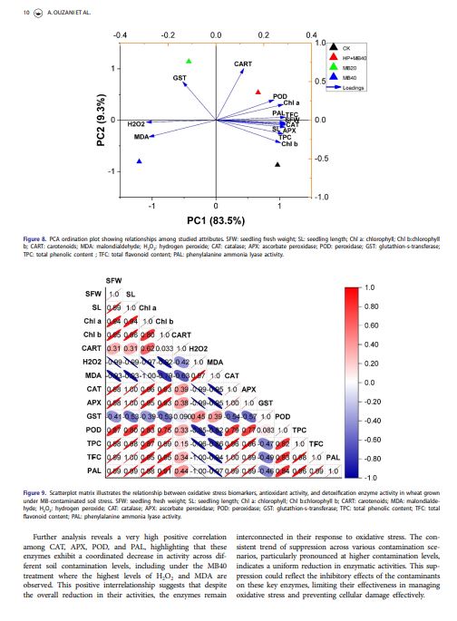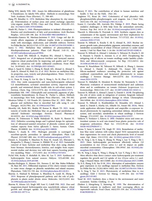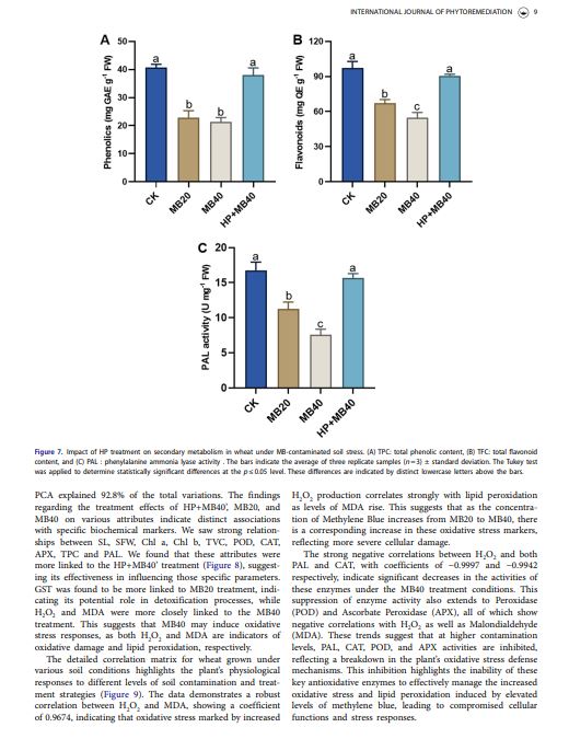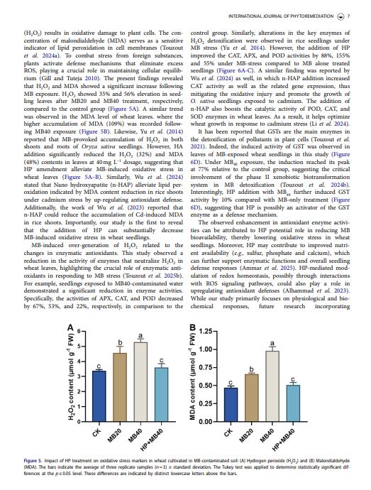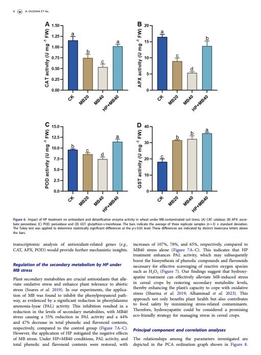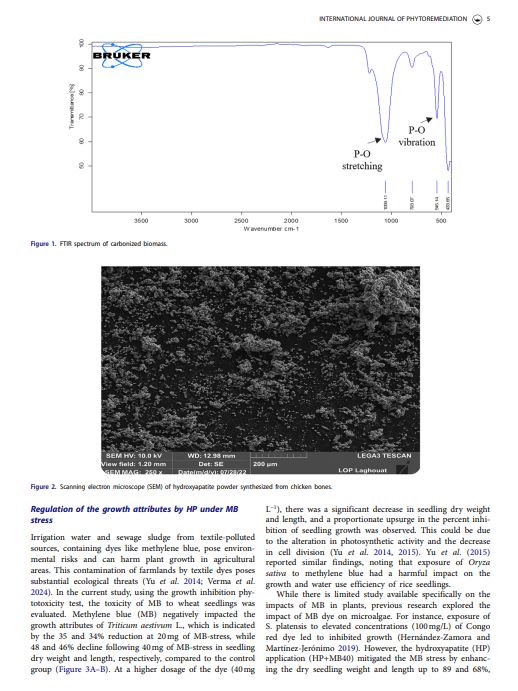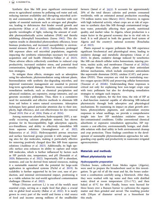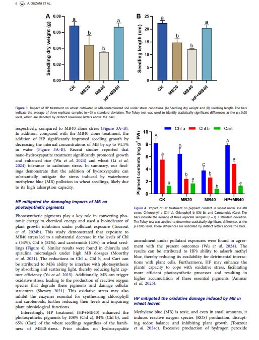 This study uniquely demonstrates hydroxyapatite’s (HP) effectiveness in mitigating methylene blue (MB)-induced stress in wheat by enhancing photosynthesis and antioxidant defense. It extends HP’s role beyond conventional applications, providing a sustainable strategy to improve crop resilience in contaminated environments.