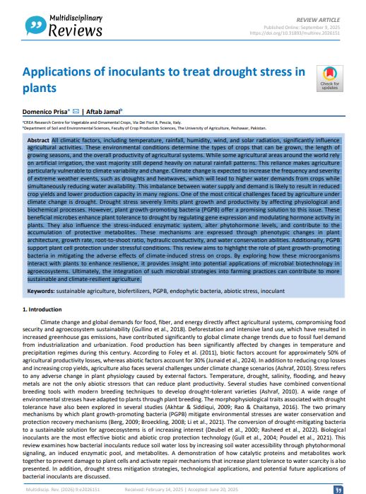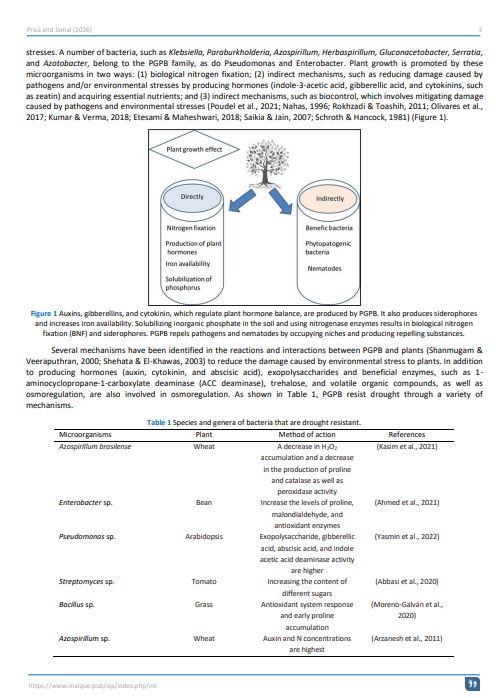 - AbstractAll climatic factors, including temperature, rainfall, humidity, wind, and solar radiation, significantly influence agricultural activities. These environmental conditions determine the types of crops that can be grown, the length of growing seasons, and the overall productivity of agricultural systems. While some agricultural areas around the world rely on artificial irrigation, the vast majority still depend heavily on natural rainfall patterns. This reliance makes agriculture particularly vulnerable to climate variability and change. Climate change is expected to increase the frequency and severity of extreme weather events, such as droughts and heatwaves, which will lead to higher water demands from crops while simultaneously reducing water availability. This imbalance between water supply and demand is likely to result in reduced crop yields and lower production capacity in many regions. One of the most critical challenges faced by agriculture under climate change is drought. Drought stress severely limits plant growth and productivity by affecting physiological and biochemical processes. However, plant growth-promoting bacteria (PGPB) offer a promising solution to this issue. These beneficial microbes enhance plant tolerance to drought by regulating gene expression and modulating hormone activity in plants. They also influence the stress-induced enzymatic system, alter phytohormone levels, and contribute to the accumulation of protective metabolites. These mechanisms are expressed through phenotypic changes in plant architecture, growth rate, root-to-shoot ratio, hydraulic conductivity, and water conservation abilities. Additionally, PGPB support plant cell protection under stressful conditions. This review aims to highlight the role of plant growth-promoting bacteria in mitigating the adverse effects of climate-induced stress on crops. By exploring how these microorganisms interact with plants to enhance resilience, it provides insight into potential applications of microbial biotechnology in agroecosystems. Ultimately, the integration of such microbial strategies into farming practices can contribute to more sustainable and climate-resilient agriculture.