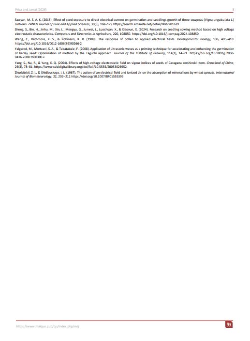 Sawsan, M. S. A. K. (2018). Effect of seed exposure to direct electrical current on germination and seedlings growth of three cowpeas (Vigna unguiculata L.) cultivars. ZANCO Journal of Pure and Applied Sciences, 30(5), 168–179.https://search.emarefa.net/detail/BIM-901639