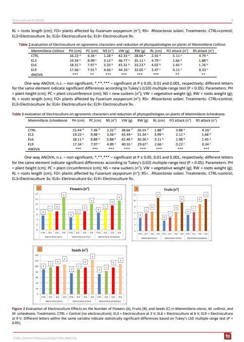 This study investigated the effects of electroculture on vegetative and root development, reproductive performance (flower and fruit production), and resistance to phytopathogens in three Mammillaria species: Mammillaria oteroi, Mammillaria collinsii, and Mammillaria schiedeana. For each species, 30 rooted cuttings were assigned to each treatment group, with three replicates of 10 plants each. Cultivation began in early August 2024, and all plants received a slow-release fertilizer incorporated into the substrate at the time of transplanting. To ensure standardized growing conditions, electric currents of 3V, 6V, and 9V were applied to the experimental pots for one hour daily. A control group of 30 plants per species received no electrical treatment. A range of agronomic and phytopathological parameters were subsequently assessed. Among all species, the 3V treatment produced the most favorable results for plant height, stem girth, vegetative, and root biomass, and root hair length. In contrast, the 9V treatment significantly enhanced the number of offshoots, flowers fruits, seed yield, and resistance to fungal pathogens. On average, the 3V treatment led to a 44.0% increase in stem circumference, a 31.3% increase in plant height, a 26% improvement in vegetative growth, and a 23% increase in root development compared to untreated controls. The 9V treatment increased flower number by 54%, fruit number by 63.2%, and seed production by 34.9% relative to controls. Additionally, plant mortality due to Fusarium oxysporum and Rhizoctonia solani was reduced by 80% and 90%, respectively, under the 9V treatment across all species. These findings demonstrate that electroculture can significantly enhance growth, reproductive output, and pathogen resistance in Mammillaria spp. Further studies across a broader range of plant taxa are warranted to confirm and generalize these results.