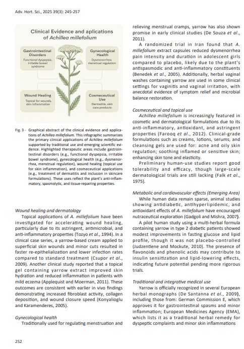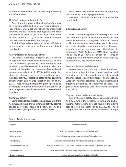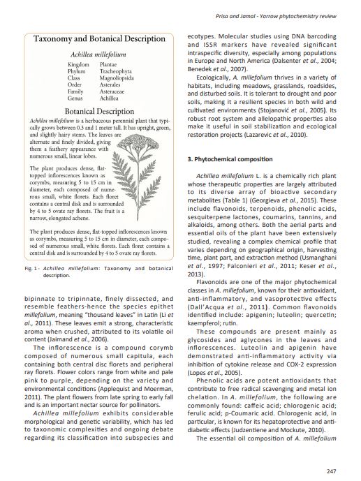 Abstract: Achillea millefolium L., commonly known as yarrow, is a perennial herb traditionally used in various cultures for its therapeutic properties. Belonging to the Asteraceae family, it has gained attention for its rich phytochemical composition, including flavonoids, terpenoids, sesquiterpene lactones, phenolic acids, and essential oils. These bioactive compounds contribute to a wide range of pharmacological activities such as antiinflammatory, antimicrobial, antioxidant, antispasmodic, and wound healing effects. Ethnobotanical use of yarrow includes treatment of gastrointestinal disorders, skin injuries, menstrual irregularities, and respiratory infections. Modern preclinical studies have substantiated many of these traditional claims, although clinical validation remains limited. Additionally, its essential oil components show potential in cosmetic and food industries due to their preservative and aromatic properties. Despite its therapeutic promise, concerns related to allergic reactions and toxicity at high doses, particularly from thujone containing oils, warrant further safety assessment. This review aims to consolidate current scientific knowledge on A. millefolium, highlighting its pharmacological relevance, phytochemical diversity, and future potential in evidence based herbal medicine and natural product development.