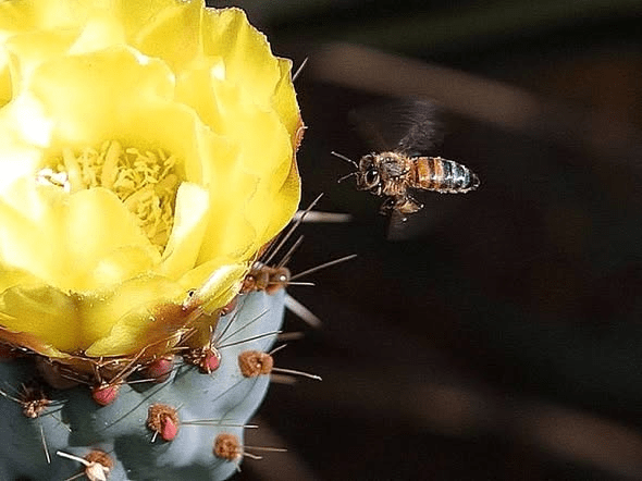 Il caso più noto è quello del fico d’India (Opuntia ficus-indica). Le sue grandi fioriture primaverili attirano api, bombi e altri insetti pronubi, offrendo nettare in quantità e polline di buona qualità. In regioni come il Mediterraneo, il Messico e alcune zone dell’Africa, le fioriture di Opuntia contribuiscono in modo significativo alla produzione di mieli monoflora o multiflora a dominante cactus.