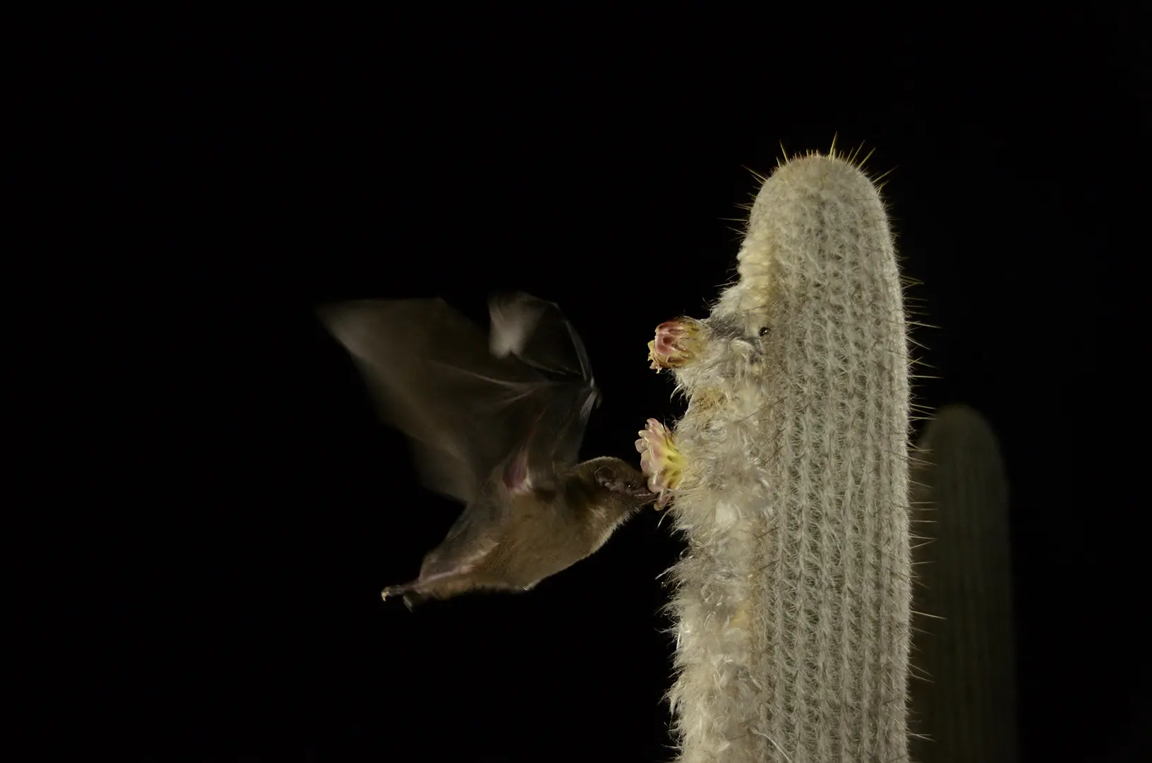 In alcuni deserti, come quello del Nord America e Messico, i pipistrelli svolgono un ruolo chiave nell’impollinazione dei grandi cactus colonnari (come il saguaro). Questi fiori si aprono di sera e producono nettare abbondante e profumi intensi proprio per attirare pipistrelli come il Lesser Long-Nosed Bat.