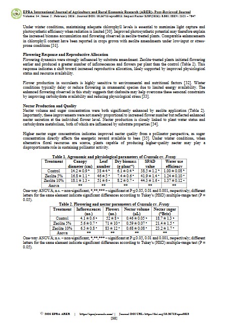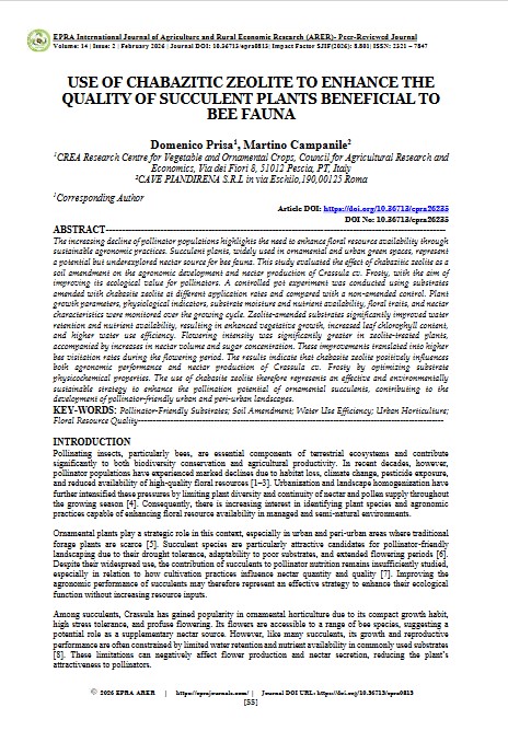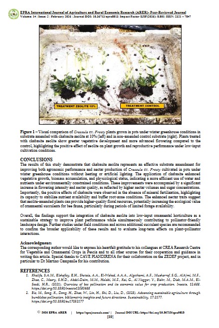The increasing decline of pollinator populations highlights the need to enhance floral resource availability through sustainable agronomic practices. Succulent plants, widely used in ornamental and urban green spaces, represent a potential but underexplored nectar source for bee fauna. This study evaluated the effect of chabazitic zeolite as a soil amendment on the agronomic development and nectar production of Crassula cv. Frosty, with the aim of improving its ecological value for pollinators. A controlled pot experiment was conducted using substrates amended with chabasite zeolite at different application rates and compared with a non-amended control. Plant growth parameters, physiological indicators, substrate moisture and nutrient availability, floral traits, and nectar characteristics were monitored over the growing cycle. Zeolite-amended substrates significantly improved water retention and nutrient availability, resulting in enhanced vegetative growth, increased leaf chlorophyll content, and higher water use efficiency. Flowering intensity was significantly greater in zeolite-treated plants, accompanied by increases in nectar volume and sugar concentration. These improvements translated into higher bee visitation rates during the flowering period. The results indicate that chabasite zeolite positively influences both agronomic performance and nectar production of Crassula cv. Frosty by optimizing substrate physicochemical properties. The use of chabasite zeolite therefore represents an effective and environmentally sustainable strategy to enhance the pollination potential of ornamental succulents, contributing to the development of pollinator-friendly urban and peri-urban landscapes.