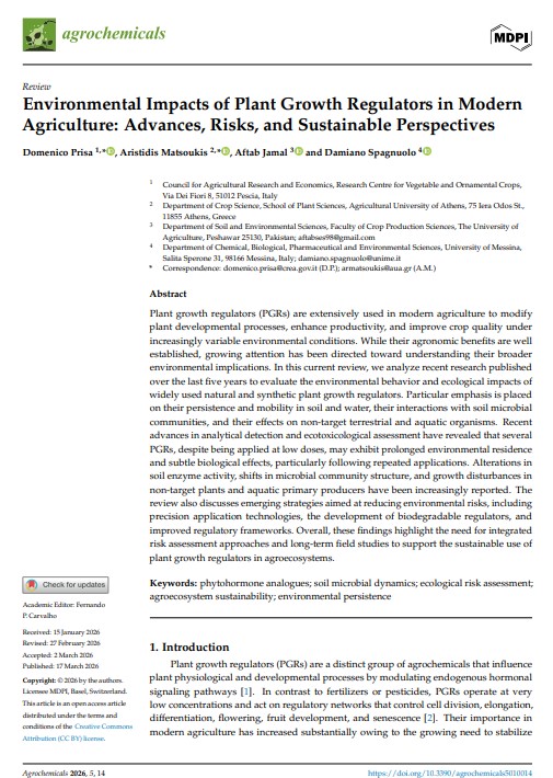 One major environmental concern is the persistence and mobility of PGRs in soil systems. Several commonly used growth regulators exhibit moderate to high stability, resulting in extended residence times that may exceed a single growing season [10]. Soil characteristics, such as organic matter content, texture, pH, and microbial activity, strongly influence degradation rates, leading to spatial and temporal variability in the environmental persistence of agrochemicals, including plant growth regulators, which are often assessed using frameworks originally developed for pesticides [11]. Repeated applications under intensive management practices may result in residue accumulation, increasing the potential for off-site transport through leaching or surface runoff.