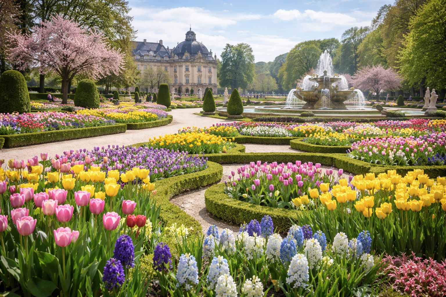 I giacinti e i tulipani erano spesso disposti in parterre elaborati, formando motivi complessi visibili dall’alto. La fioritura stagionale diventava un evento atteso, capace di trasformare completamente il giardino.